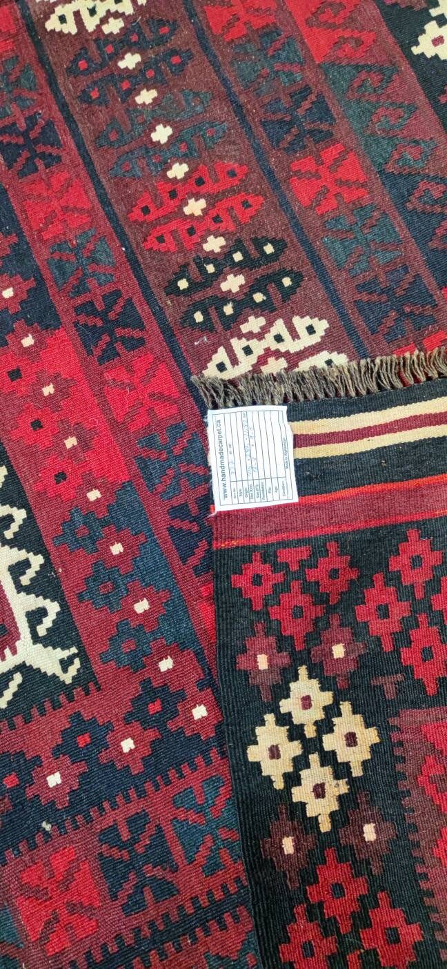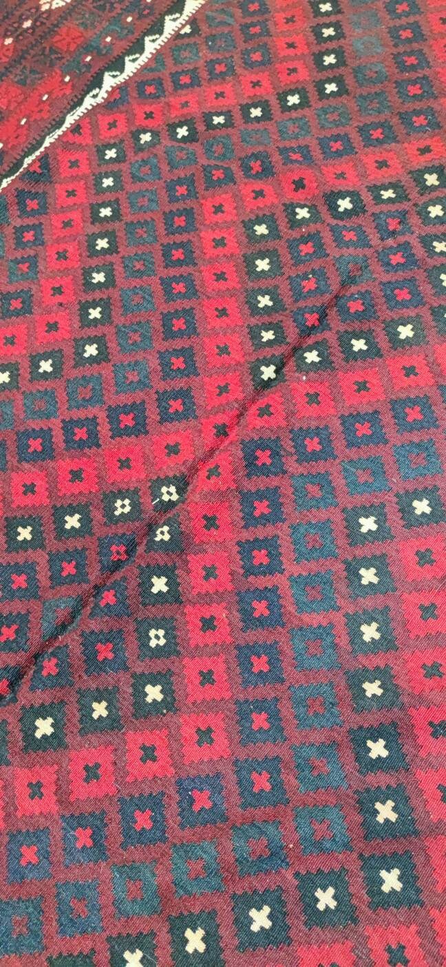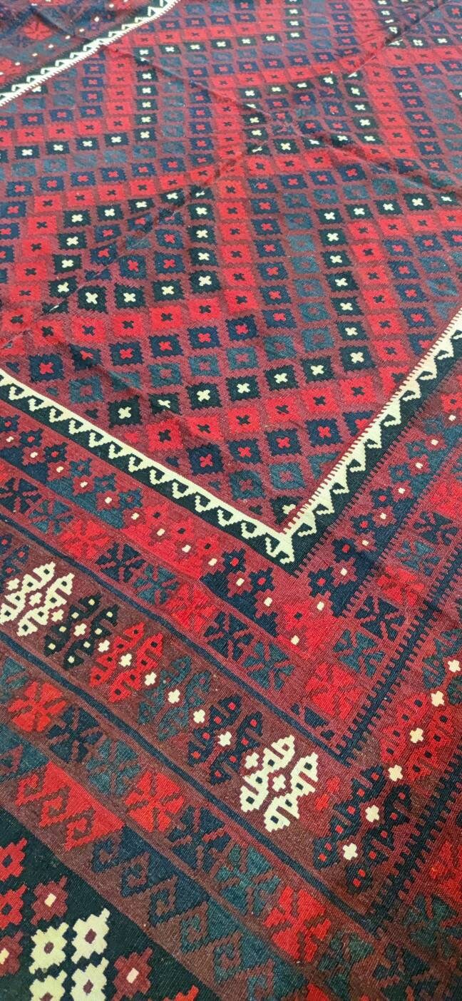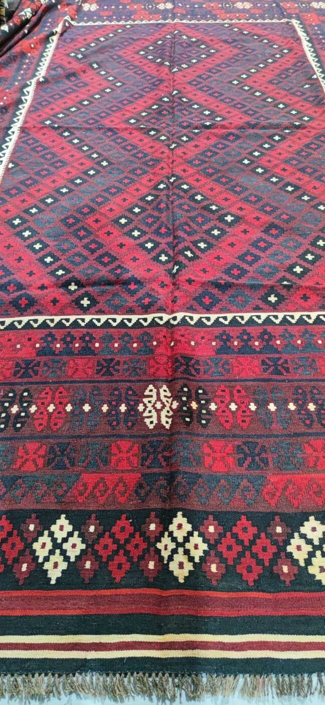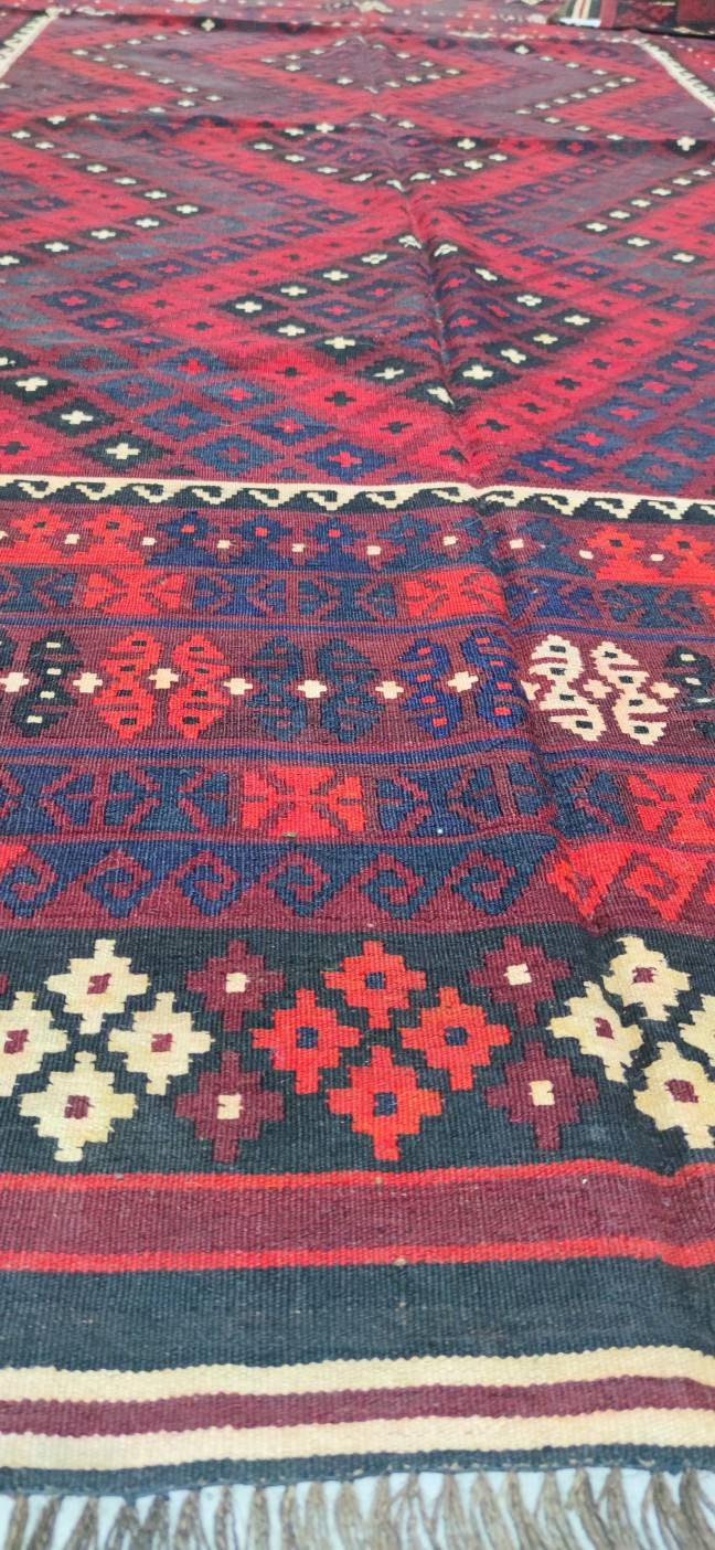 This is a well-made vintage Kilim rug made with wool vegetable dyes made in Maimana, capital of the Faryab province, northern Afghanistan. Maimana Kilims are beautifully woven in Afghanistan and recognizable by the rhythmic geometric patterns and rich colors like strong reds, oranges, blues, and rusty browns. This Kilim is in good condition clean without any damage. You can use both sides of the kelim and because of it's beautiful soft colors, it's timeless and fits perfectly with your home design.