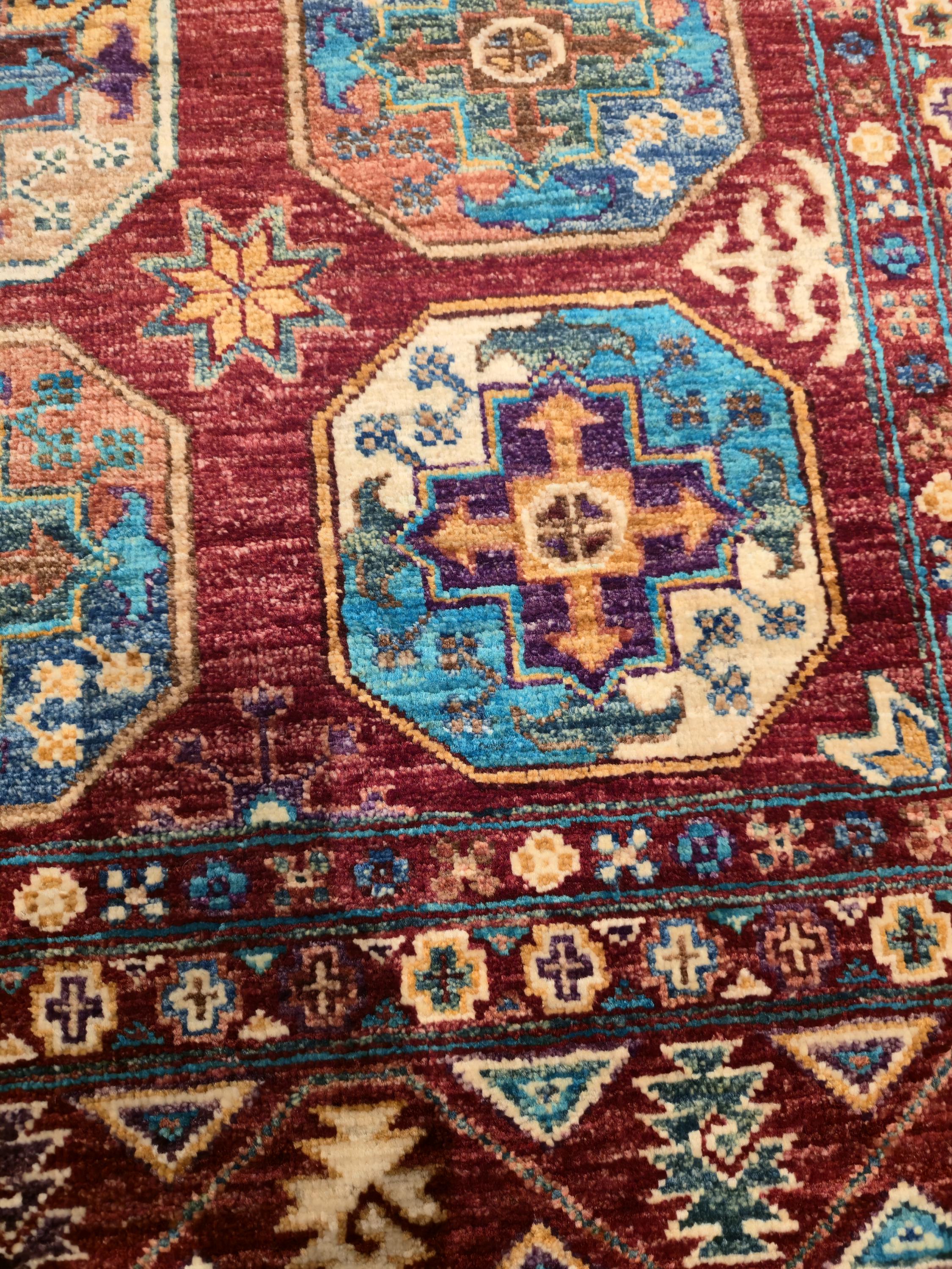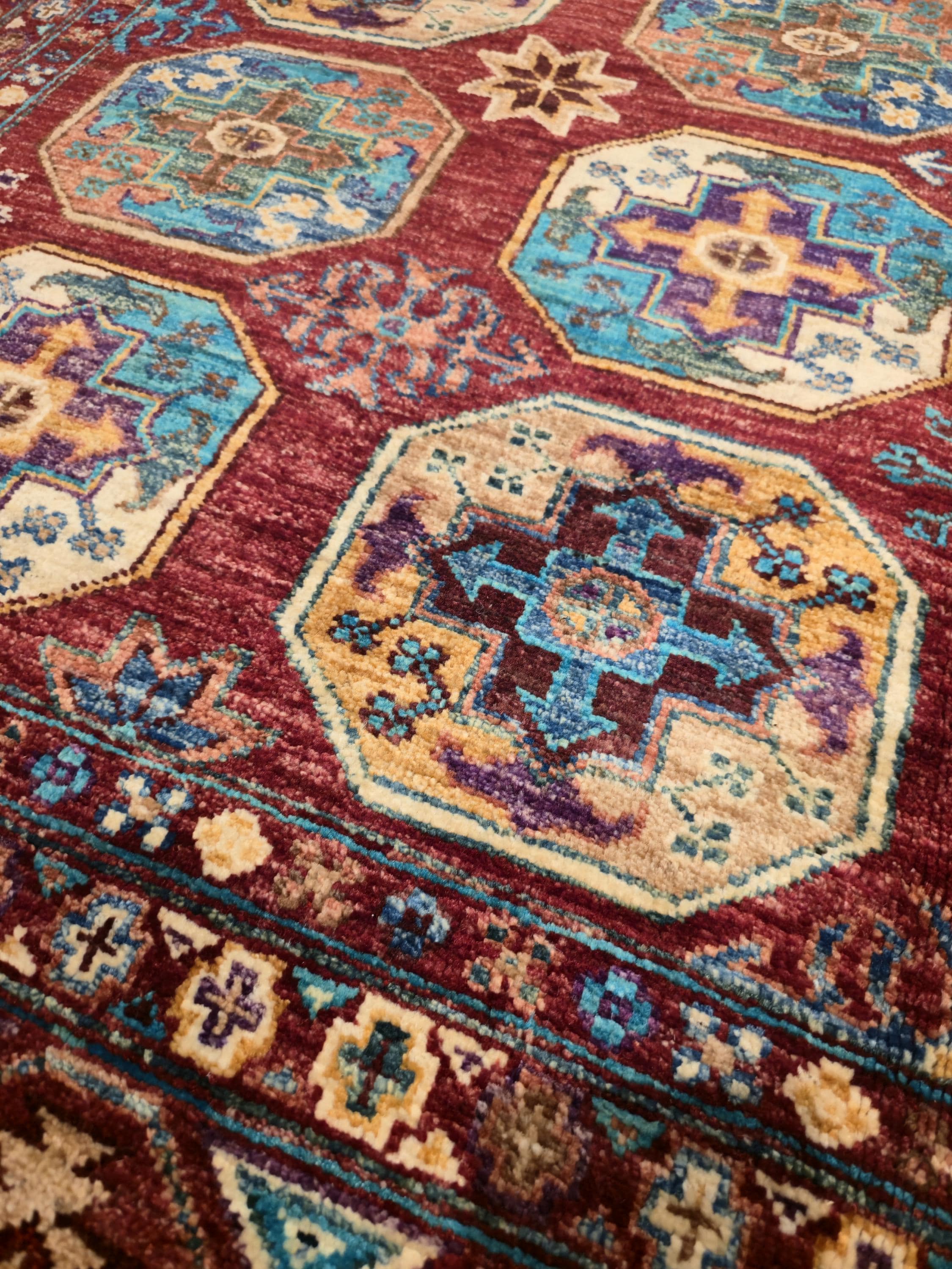 design rug made with famous Afghan Ghazni wool (silk-like soft and durable) on a cotton foundation by Afghan Turkmen artisans in Maymana the capital city of Faryab Province in northwestern Afghanistan, near Turkmenistan border.