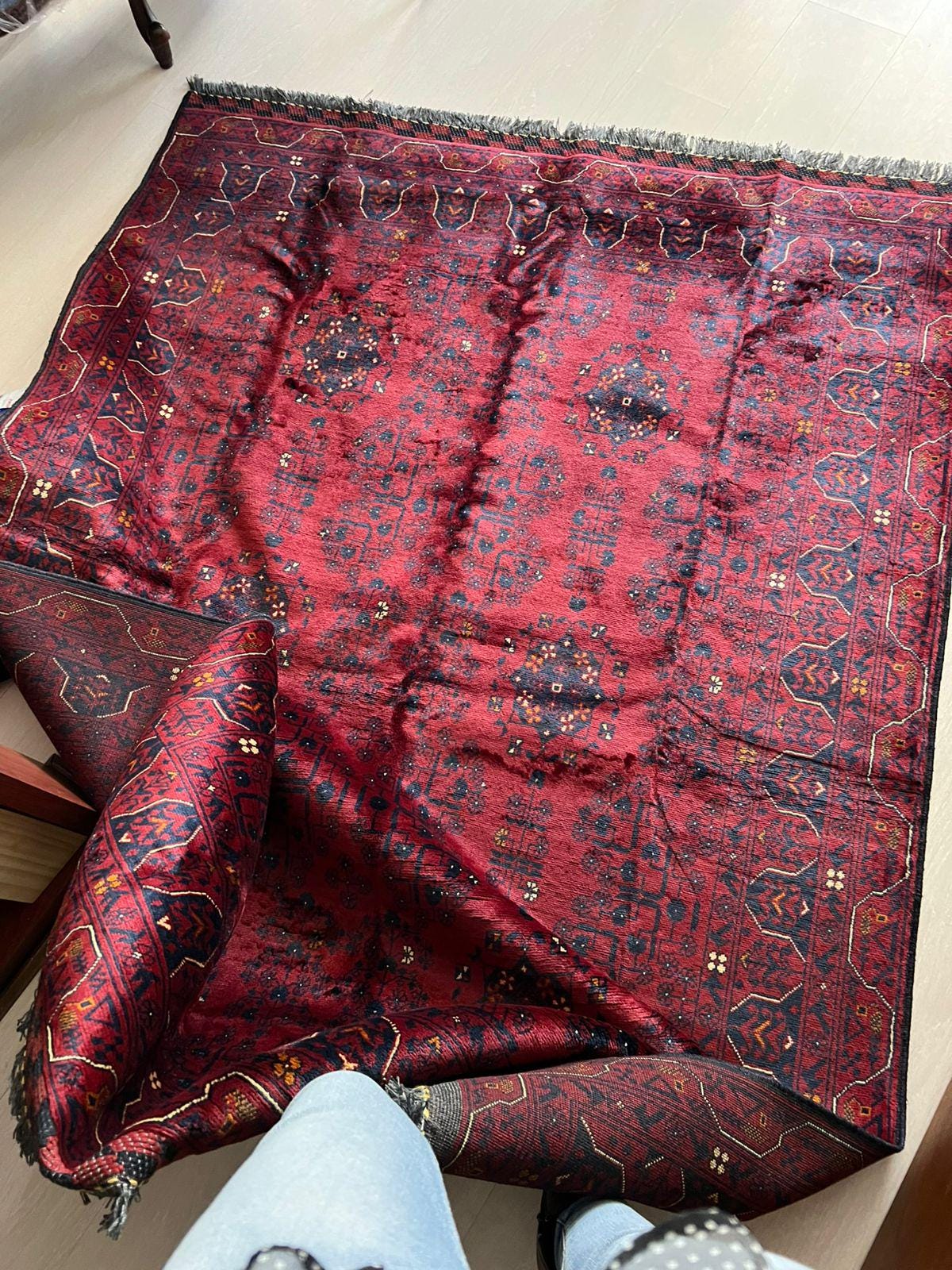 This is pre-owned, the color is not red as the ad, but brown-red, it has weird lumps (?) that won't go out in some parts of it, that I believe are patches to amend it, this was previously owned and I received it far after the purchase, reason why I still bought other tapestries from this seller. This was sold as new but is used and patched. Besides, I hate the color, it is sold as bright red, and for almost 600 USD, receiving an used, patched tapestry is lame. I asked the seller to send by postal service to avoid paying a fortune on additional fees, but I was still taxed because even by postal he didn't send it the right way. But what I am really angry about is the product itself, it was previously used, is patched (those dark lumps that won't go), and color is not even as close to the one in the picture.