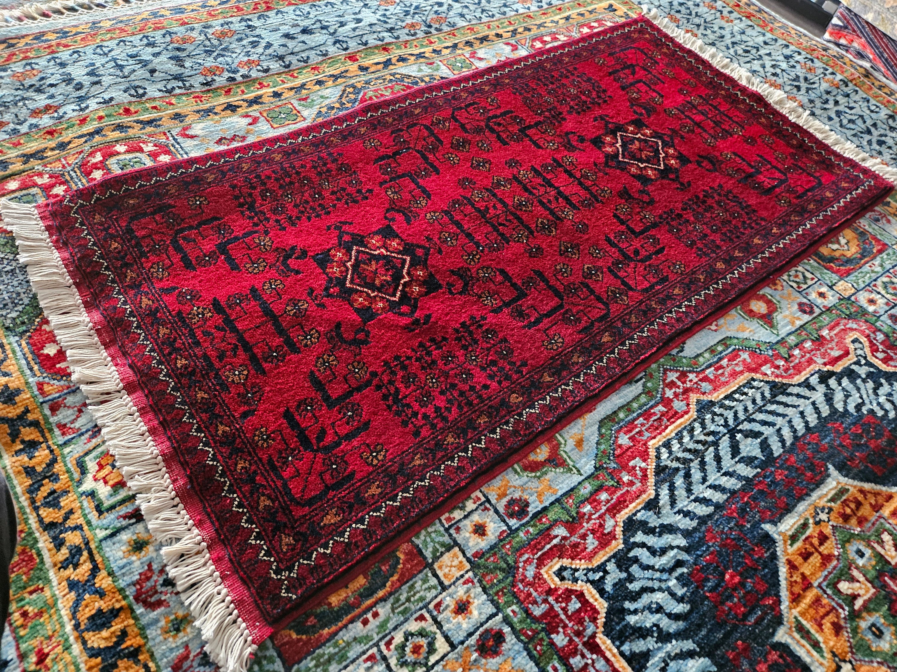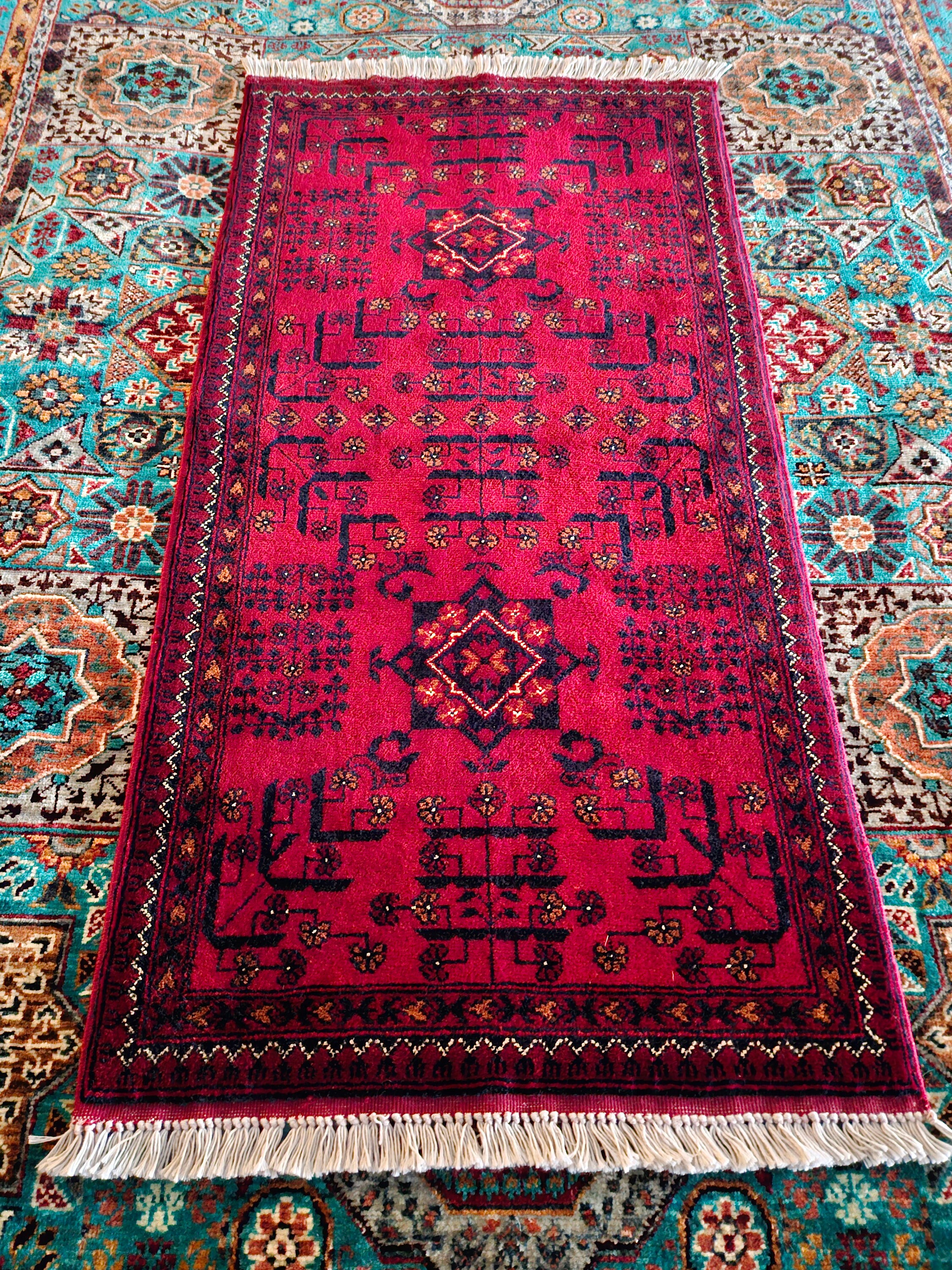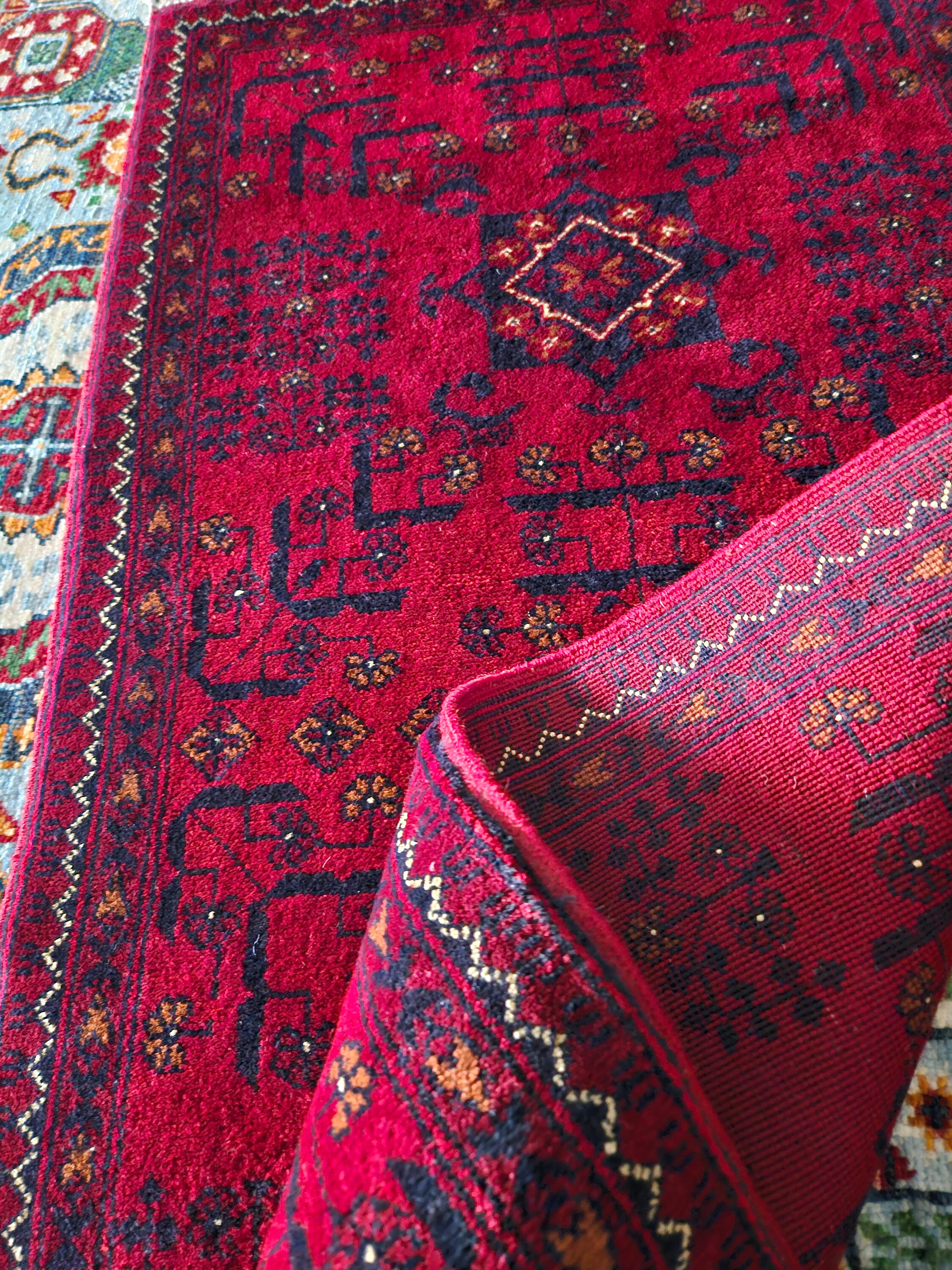 This is a brand new Afghan "Belgic" Bokhara designed rug made of high-quality Merino wool which is the finest in the world and extremely soft to touch, from New Zealand. This specific design's history goes back centuries and the craftsmanship required to create this rug is extremely high. Ghazni is known for having one of the highest quality of wool in the world and with 45/45 knots per 10cm2, it's some of our tightest knotted rugs. This kind of rug takes years to finish and will last you more than a lifetime.