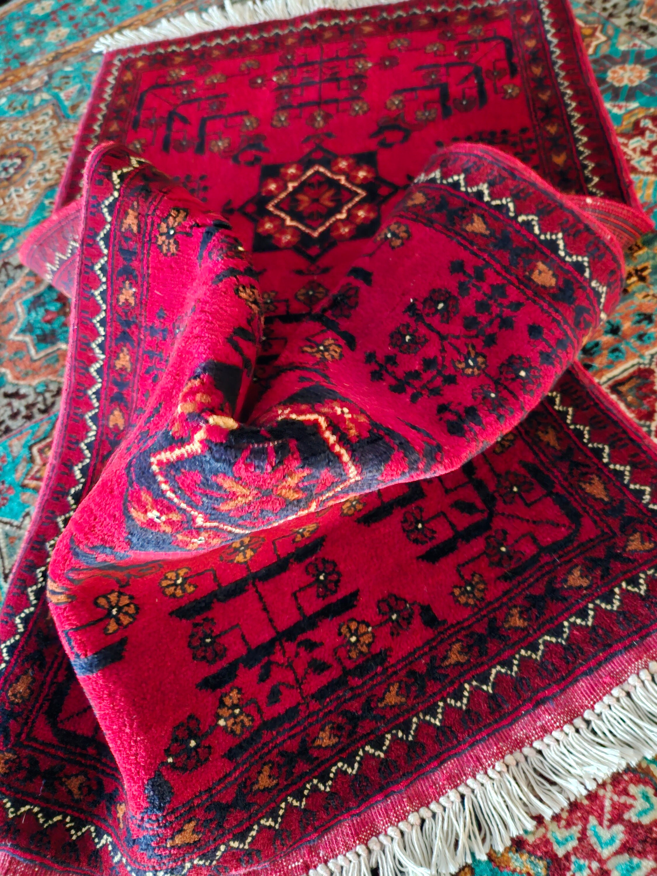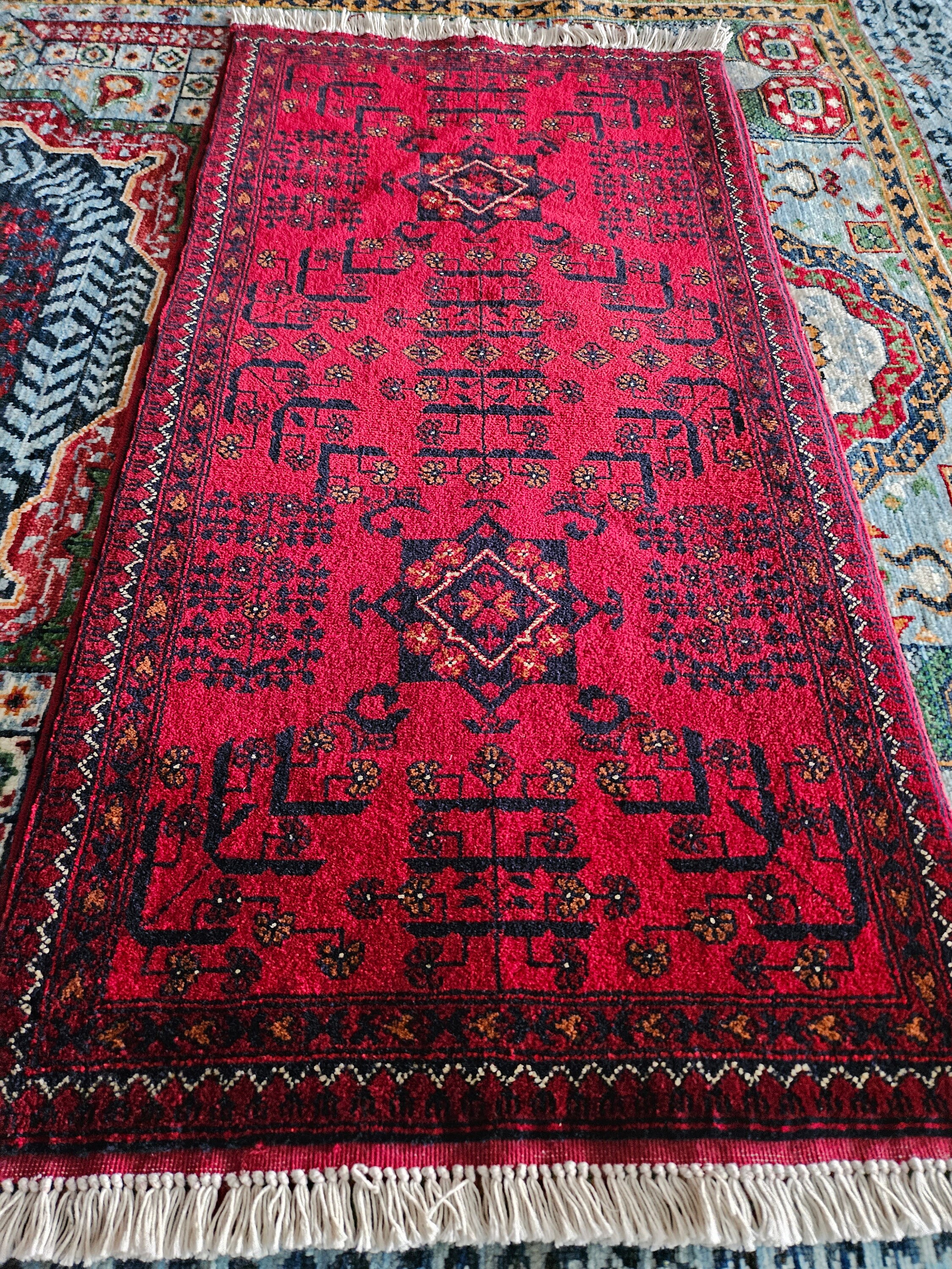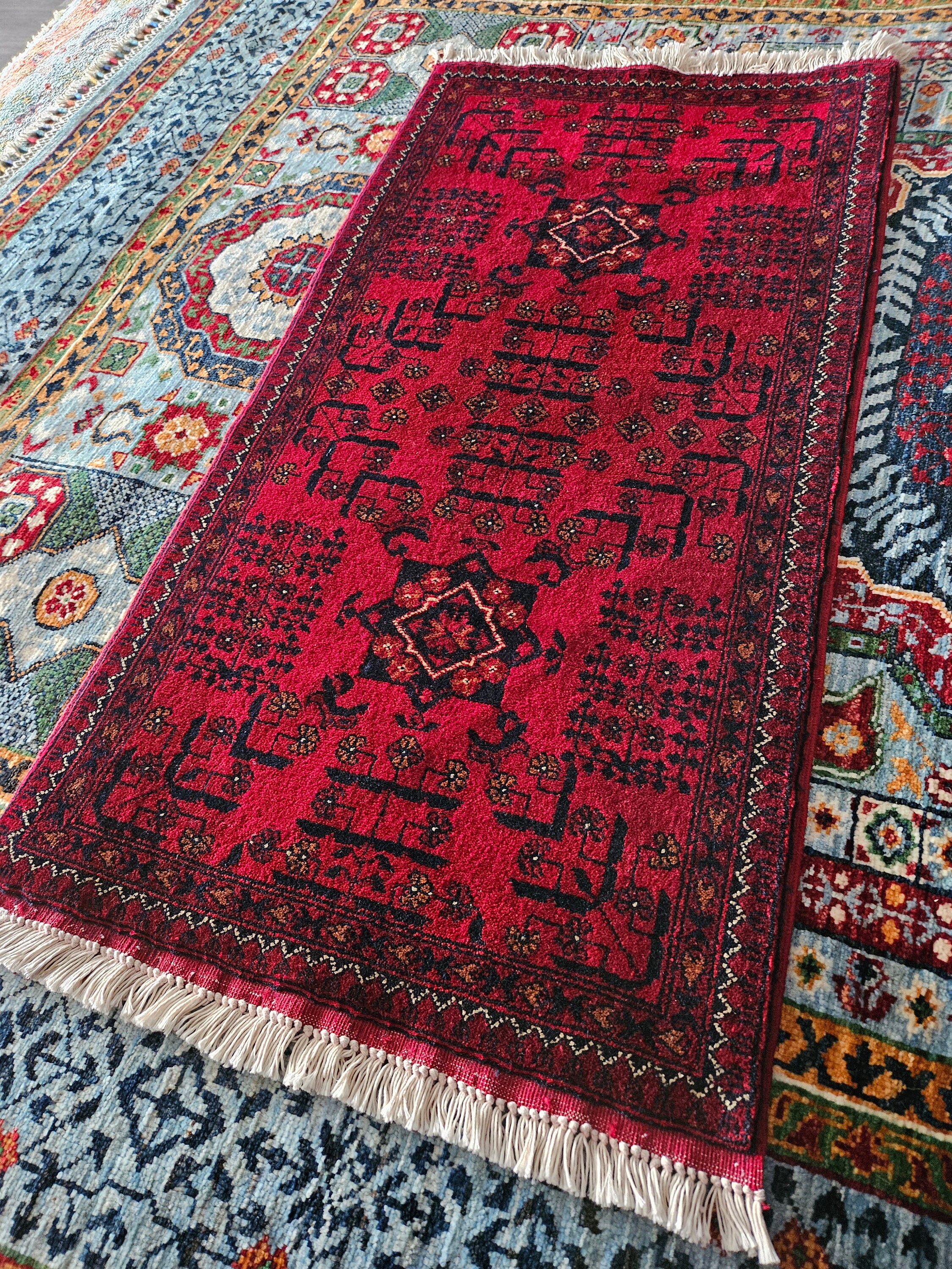 This is a brand new Afghan "Belgic" Bokhara designed rug made of high-quality Merino wool which is the finest in the world and extremely soft to touch, from New Zealand. This specific design's history goes back centuries and the craftsmanship required to create this rug is extremely high. Ghazni is known for having one of the highest quality of wool in the world and with 45/45 knots per 10cm2, it's some of our tightest knotted rugs. This kind of rug takes years to finish and will last you more than a lifetime.