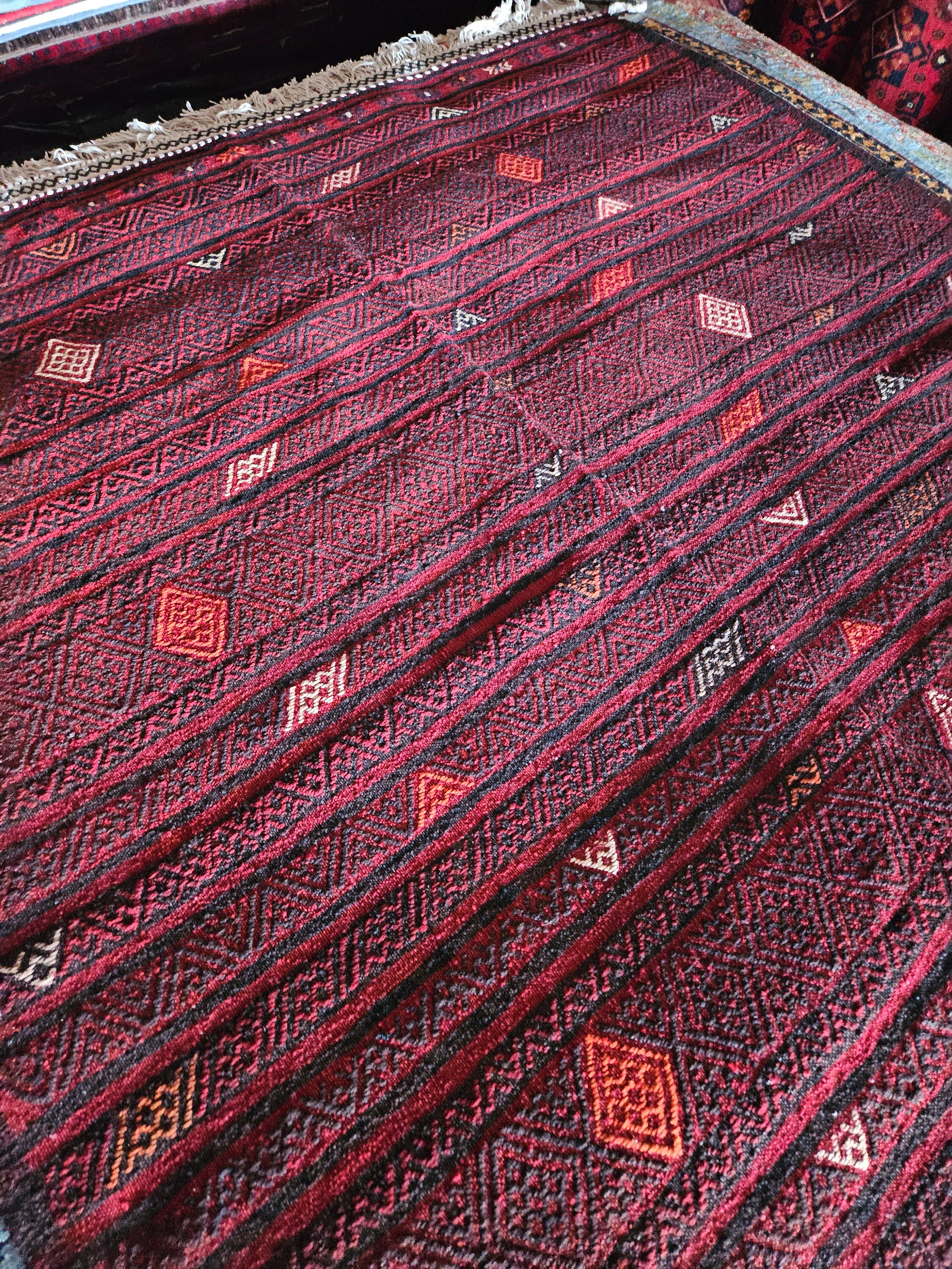 Uniquely designed and especially handwoven vintage rugs are becoming more than a trend. But they are so much expensive too. Here we represent you an authentic handcrafted Afghan kilim rug with high quality and durability to elevate your house flooring attraction. This is an authentic hand-woven rug by Afghan Turkmen with high-quality Afghan wool dyed in natural dyes. This is definitely going to give a distinctive look to your house at affordable price. So snatch this beauty from our collection to jazz up your house beauty and stay happy.