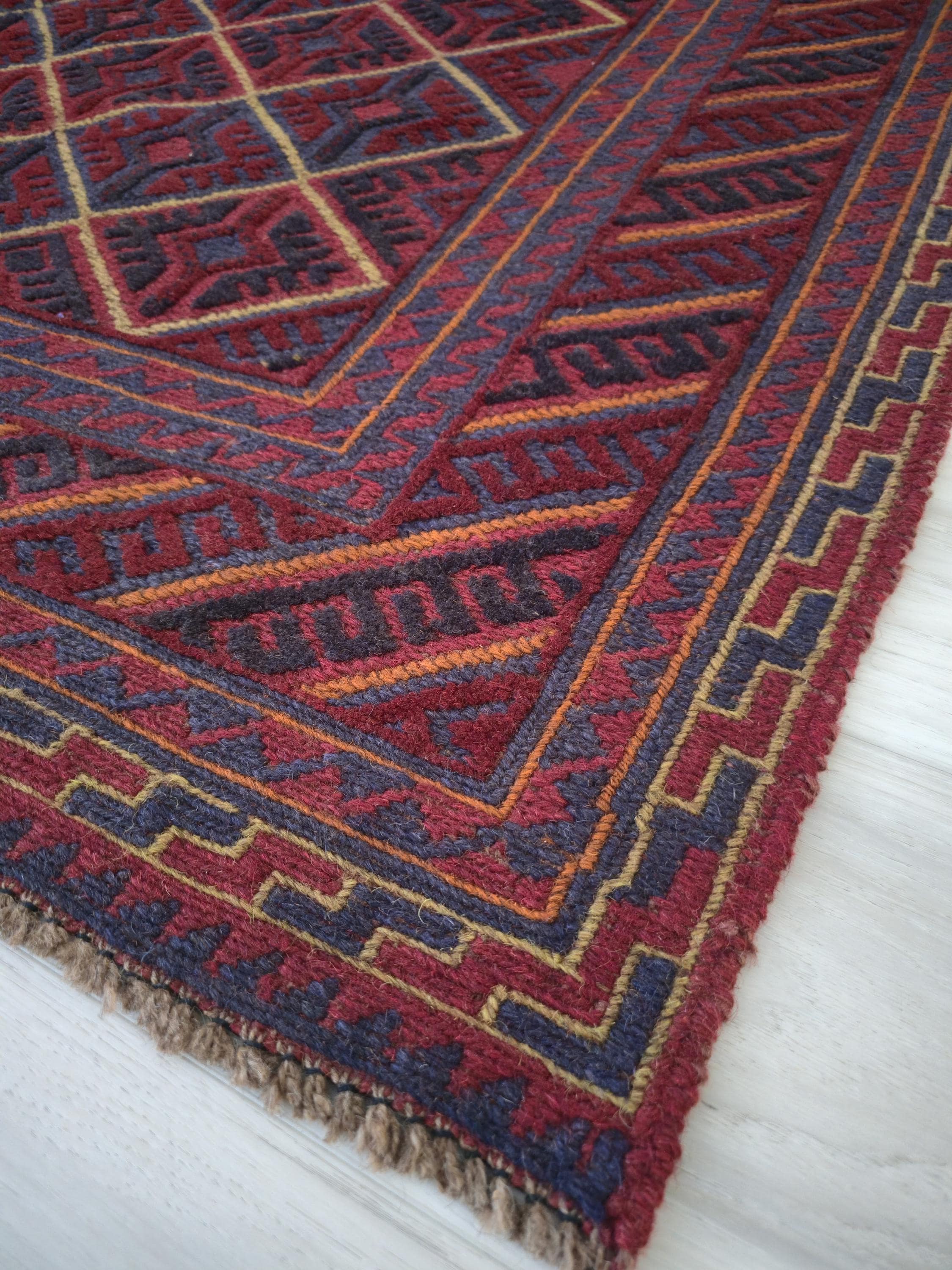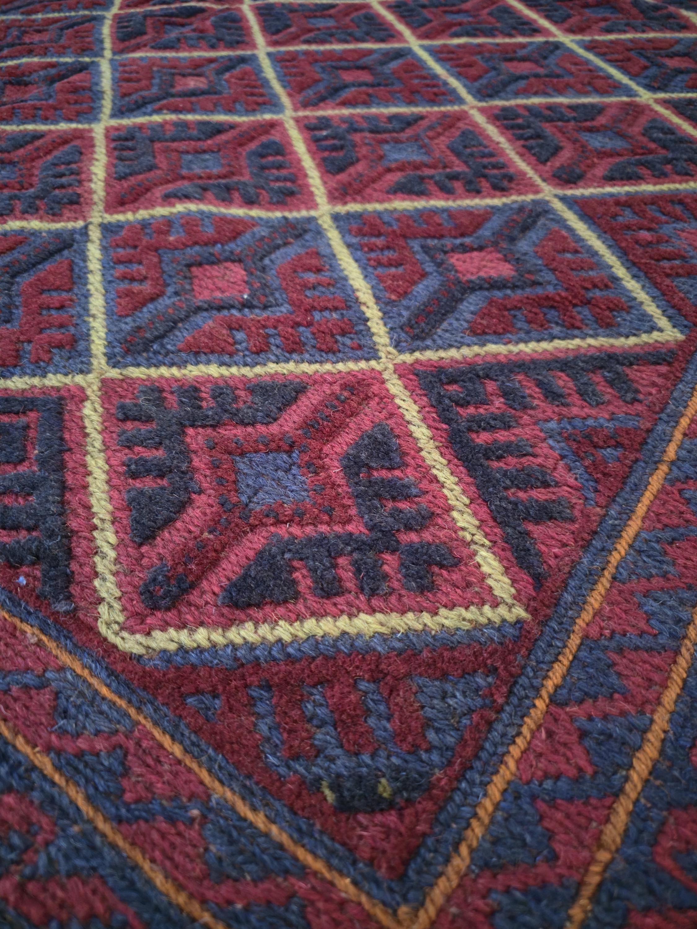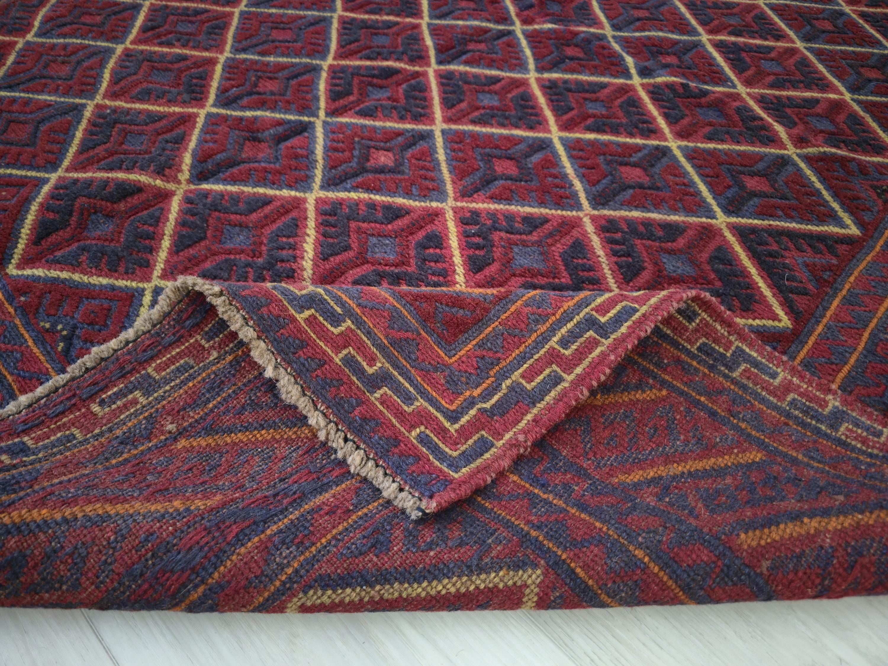 These wonderful tribal rugs are woven by the Mushwani people in Herat provinces of Afghanistan. They feature a unique mixed weave structure including knotted pile. This is considered one of the most difficult handmade rug weaving, as they make the flat weave klim first and then make the pile on top of some patterns. The Mushwani are descendants of Turkmens and a tribe located south of Herat near Shindand. They are sometimes incorrectly identified as a Baluch tribe.