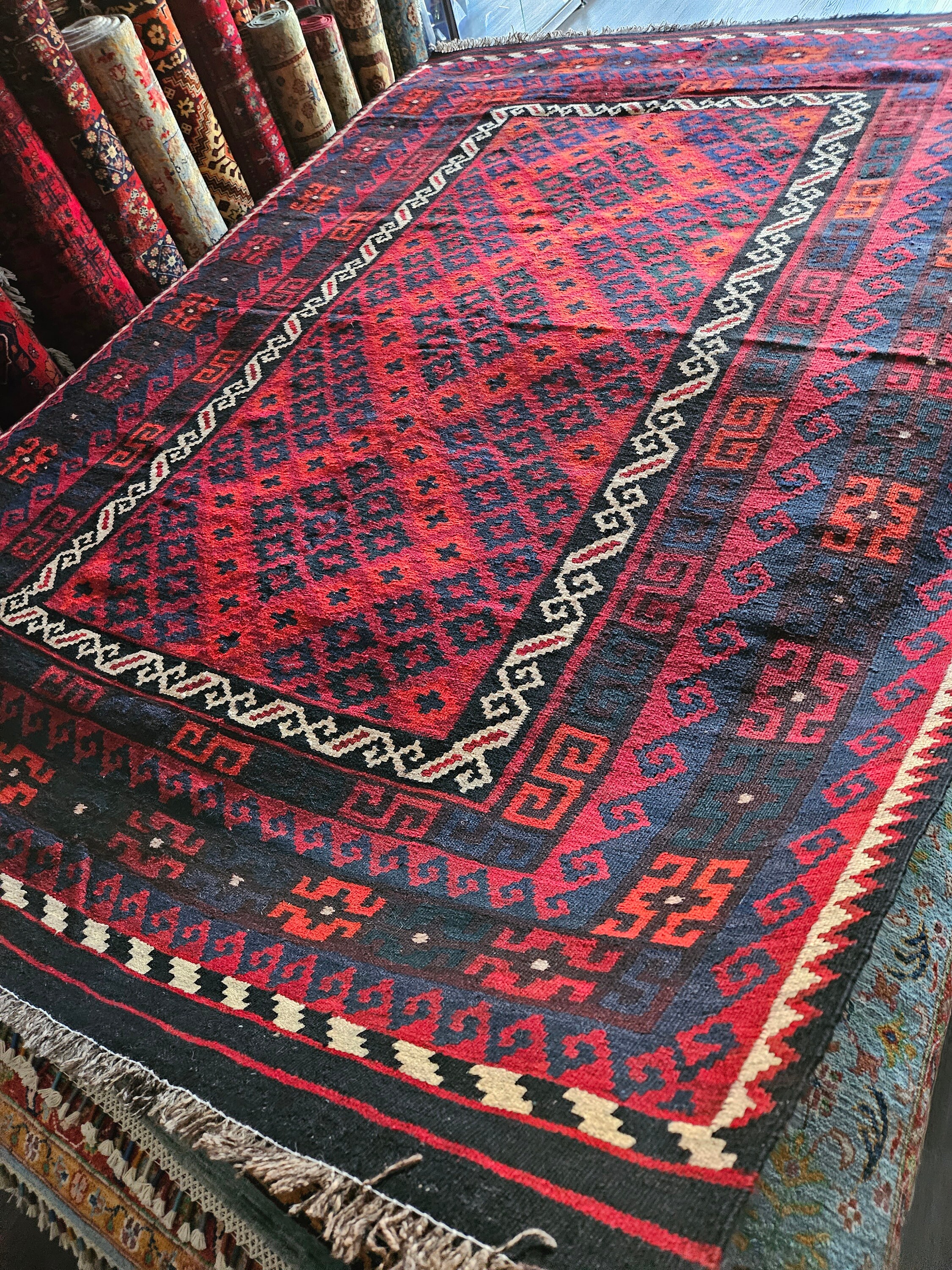 This kilim rug is a vintage well-made "Maimana" Kilim that is originated from Afghanistan. It is made with soft sheep wool on a cotton foundation which ensures a soft yet durable feeling on the surface. Maimana rugs are known for their tightly knotted rugs, which is why they are famous for their shell-life and durability in high usage areas. Rugs like these are meant to last for a lifetime without any sign of age on the rug itself. This kilim rug is colored with natural vegetable dyes, meaning the color of the wool will not change over time.