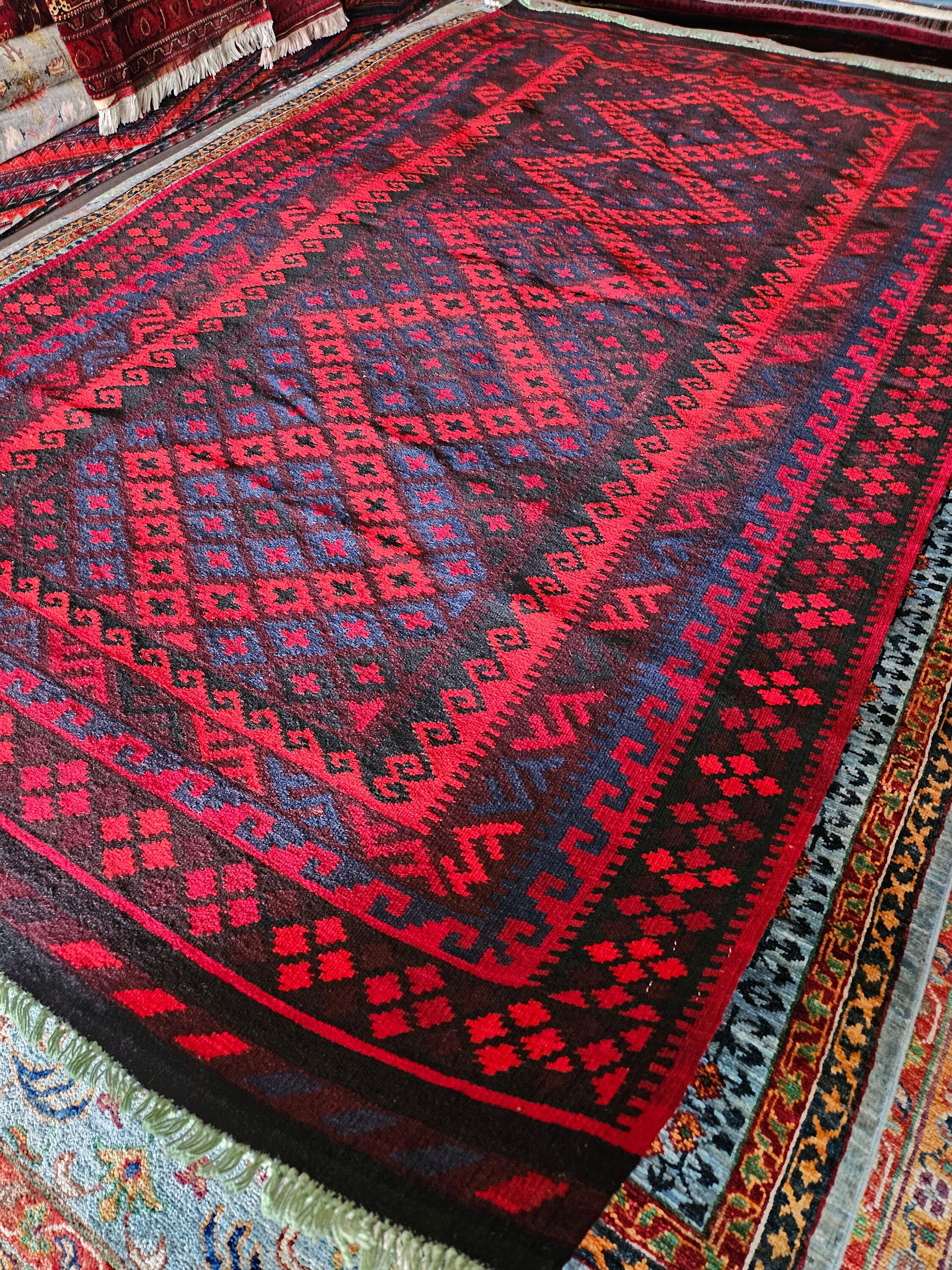 This kilim rug is a brand new well-made "Maimana" Kilim that is originated from Afghanistan. It's made with soft sheep wool on a cotton foundation which ensures a soft yet durable feeling on the surface. Maimana rugs are known for their tightly knotted rugs, which is why they are famous for their shell-life and durability at high usage areas. Rugs like these are meant to last for a lifetime without any sign of age on the rug itself. This kilim rug is colored with natural vegetable dyes, meaning the color of the wool will not change over time.