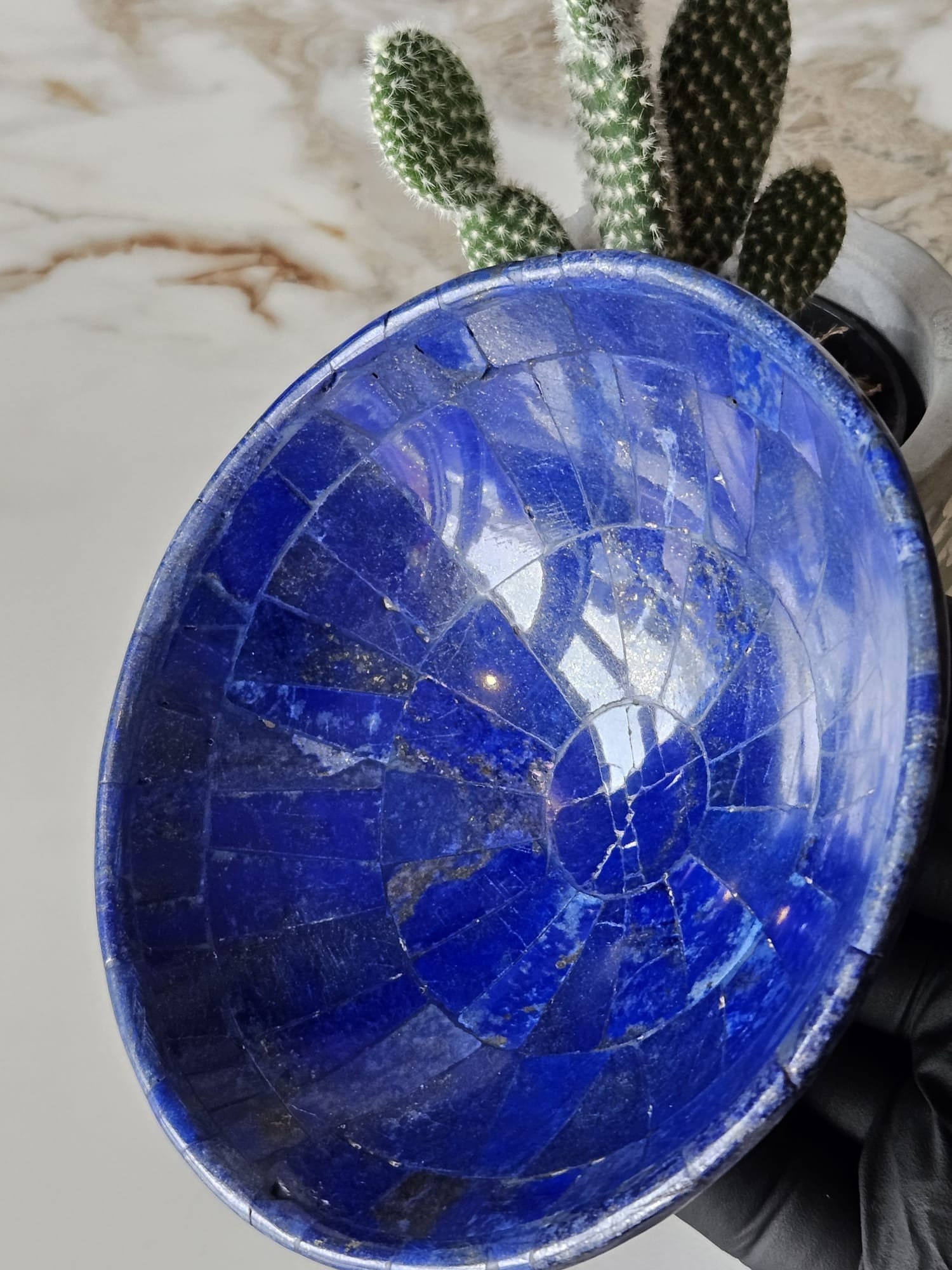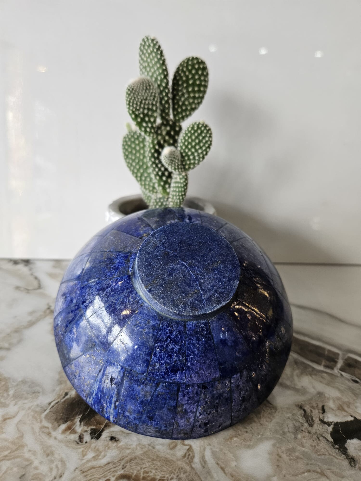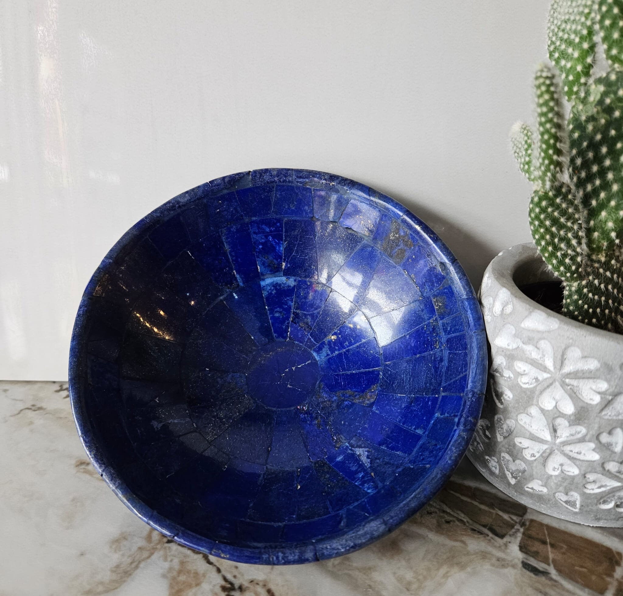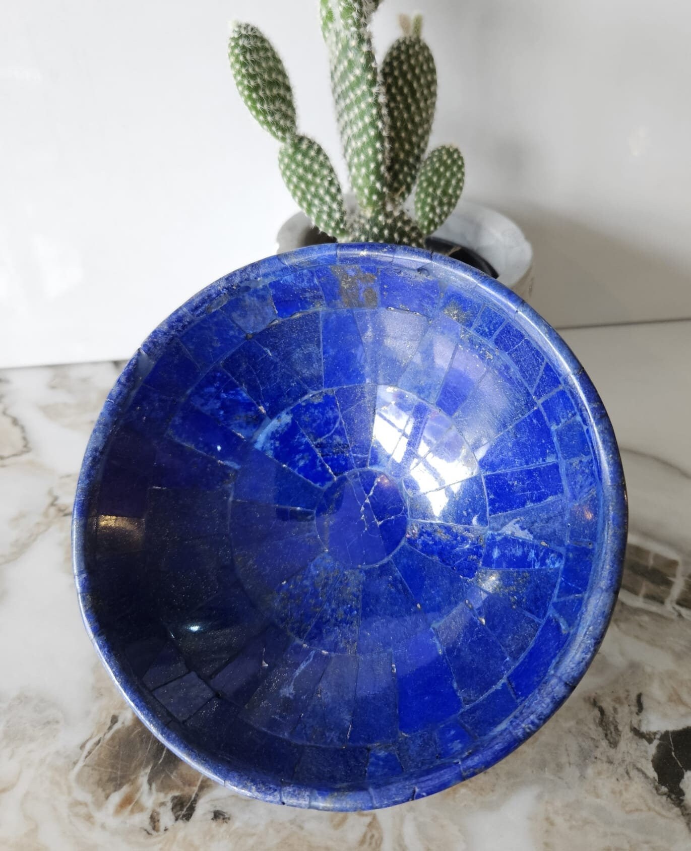 Each bowl is carved from a single block of genuine lapis lazuli and expertly polished to achieve a smooth and sophisticated finish. The unique natural patterns in the stone add a touch of individuality to every piece. This bowl has been hand made Pieces put together using Mosaic technic, and is very unique. There is no second bowel the same as this one.