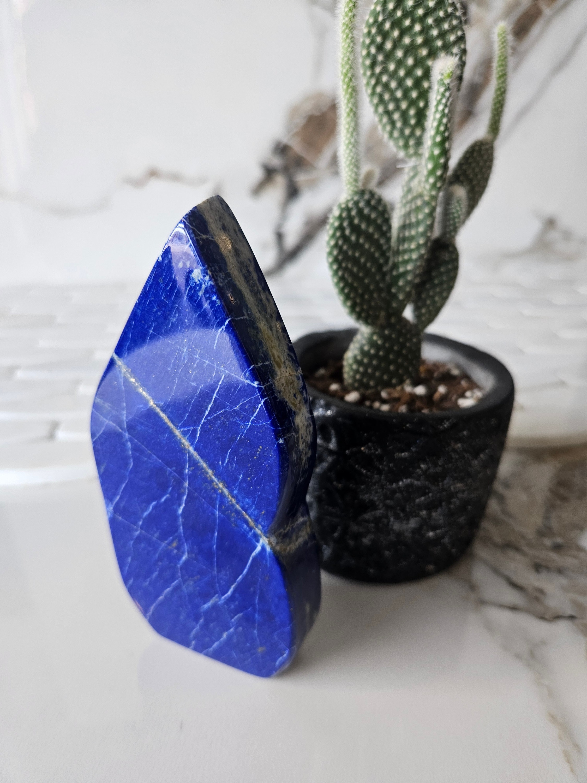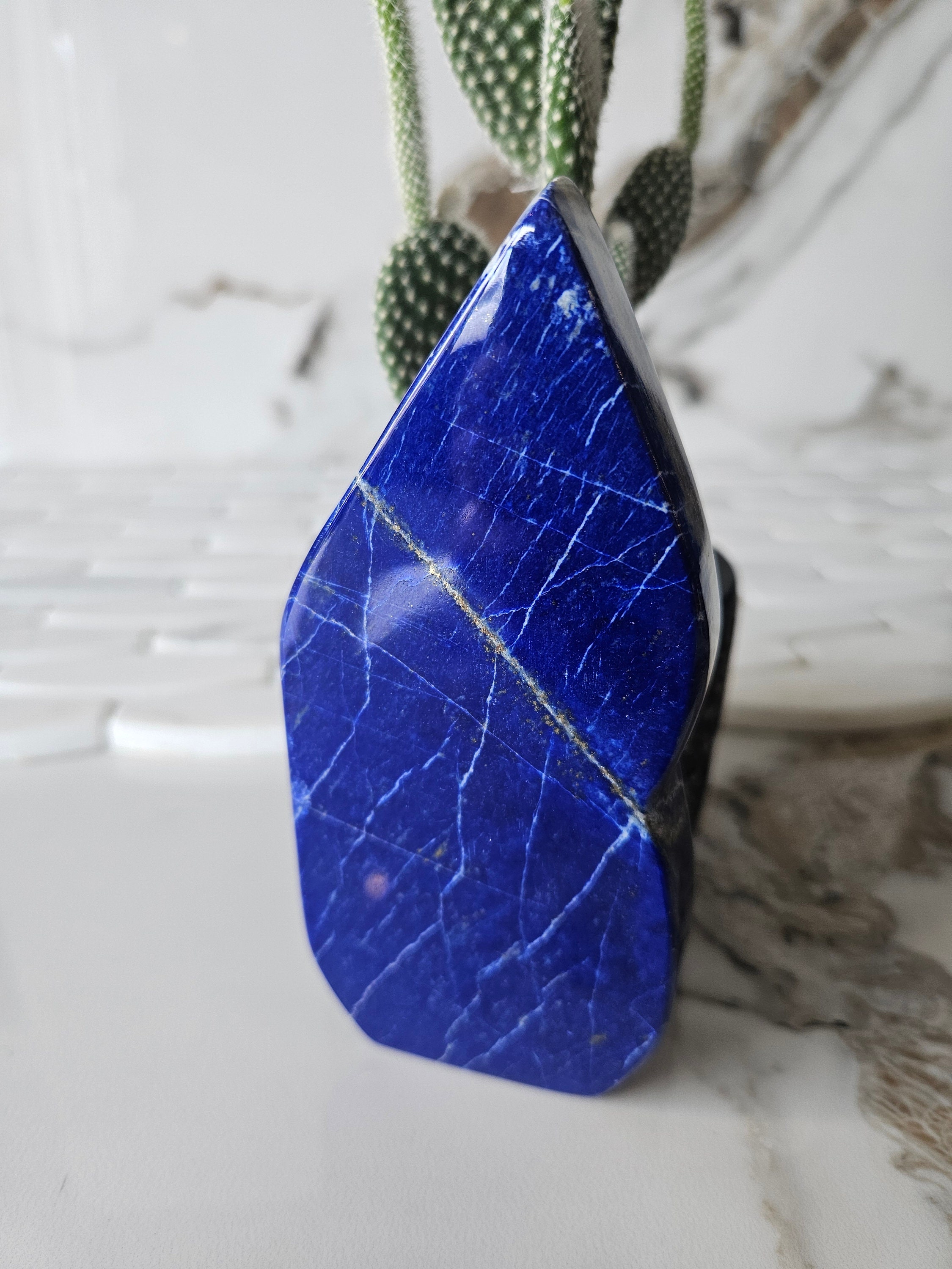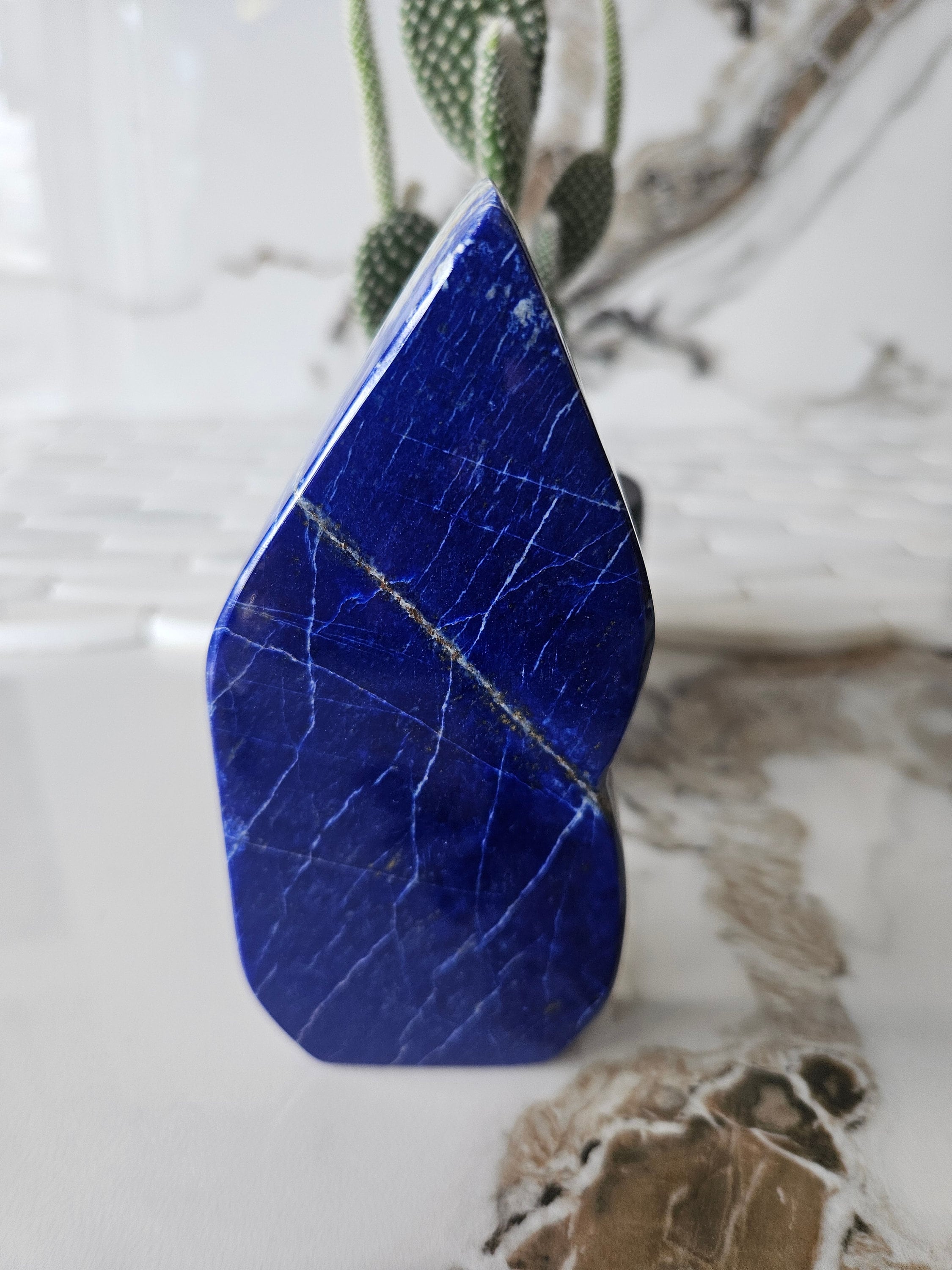 This royal blue crystal features subtle pyrite streaks, giving it a metallic flash.
