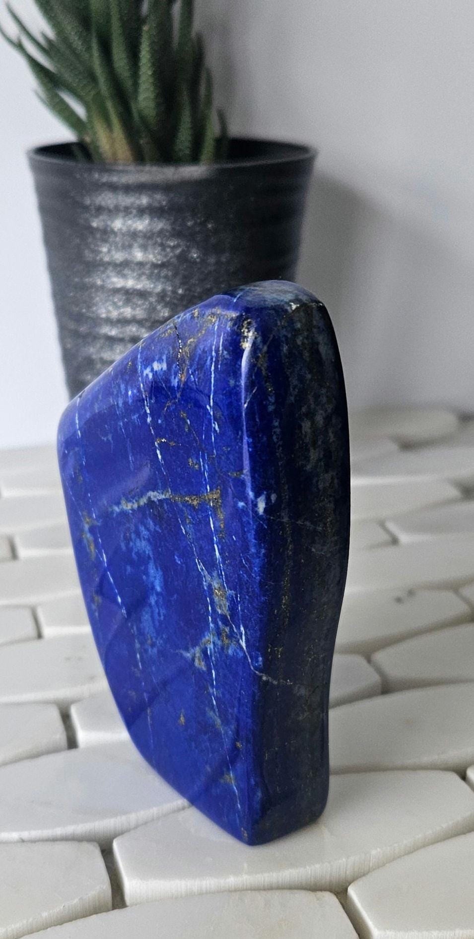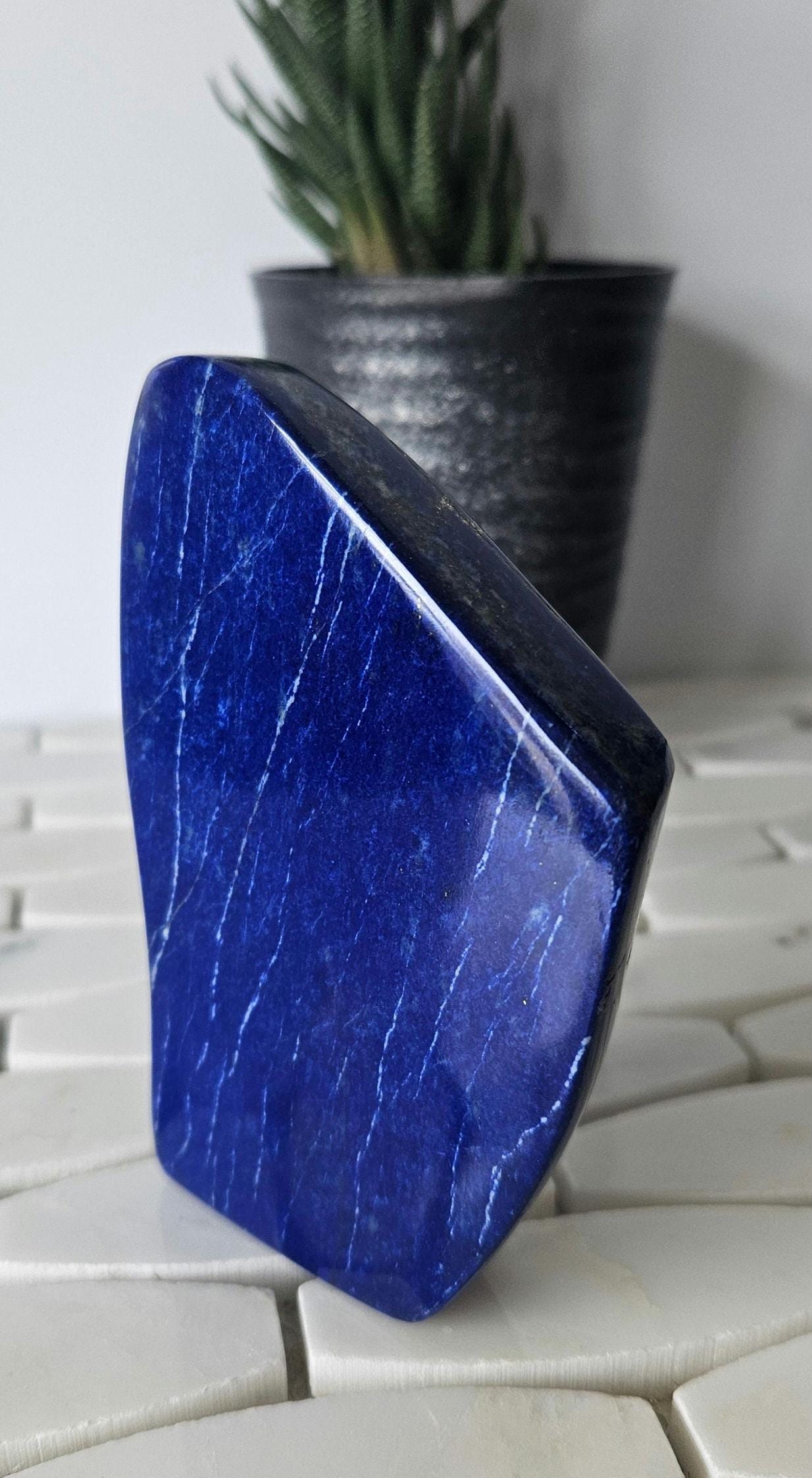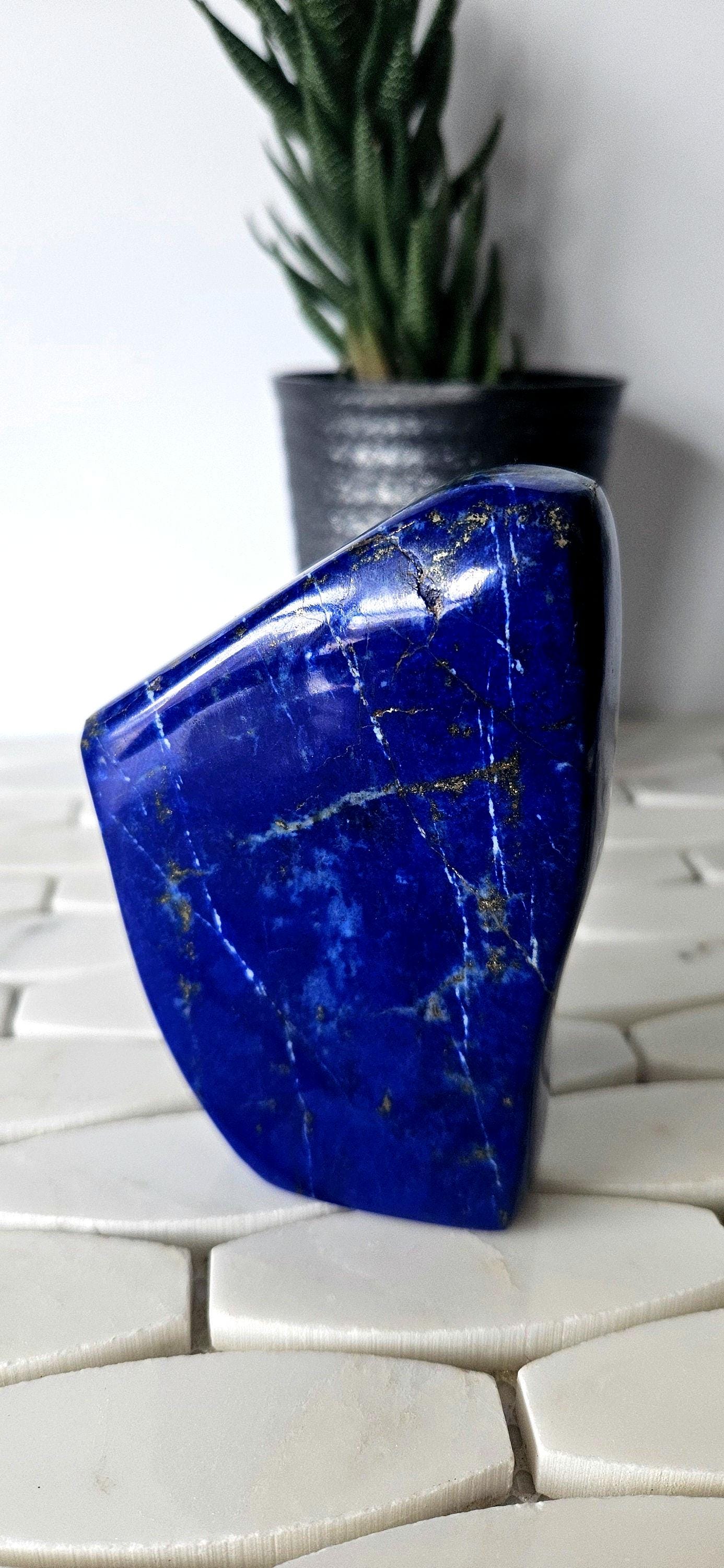 This is a unique A++ Grade Lapis Lazuli from Afghanistan. All the pictures and videos were taken in natural sunlight to showcase its true color, and all the tiny details that make each of the stones unique.