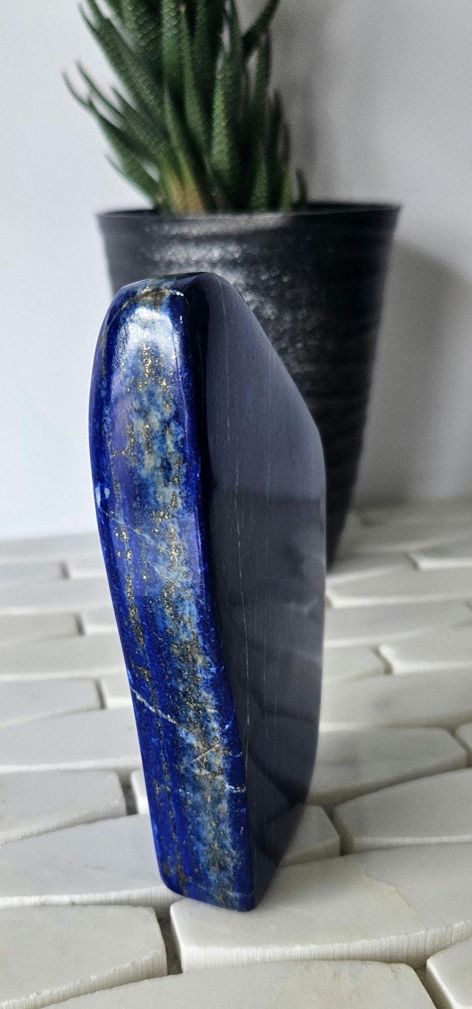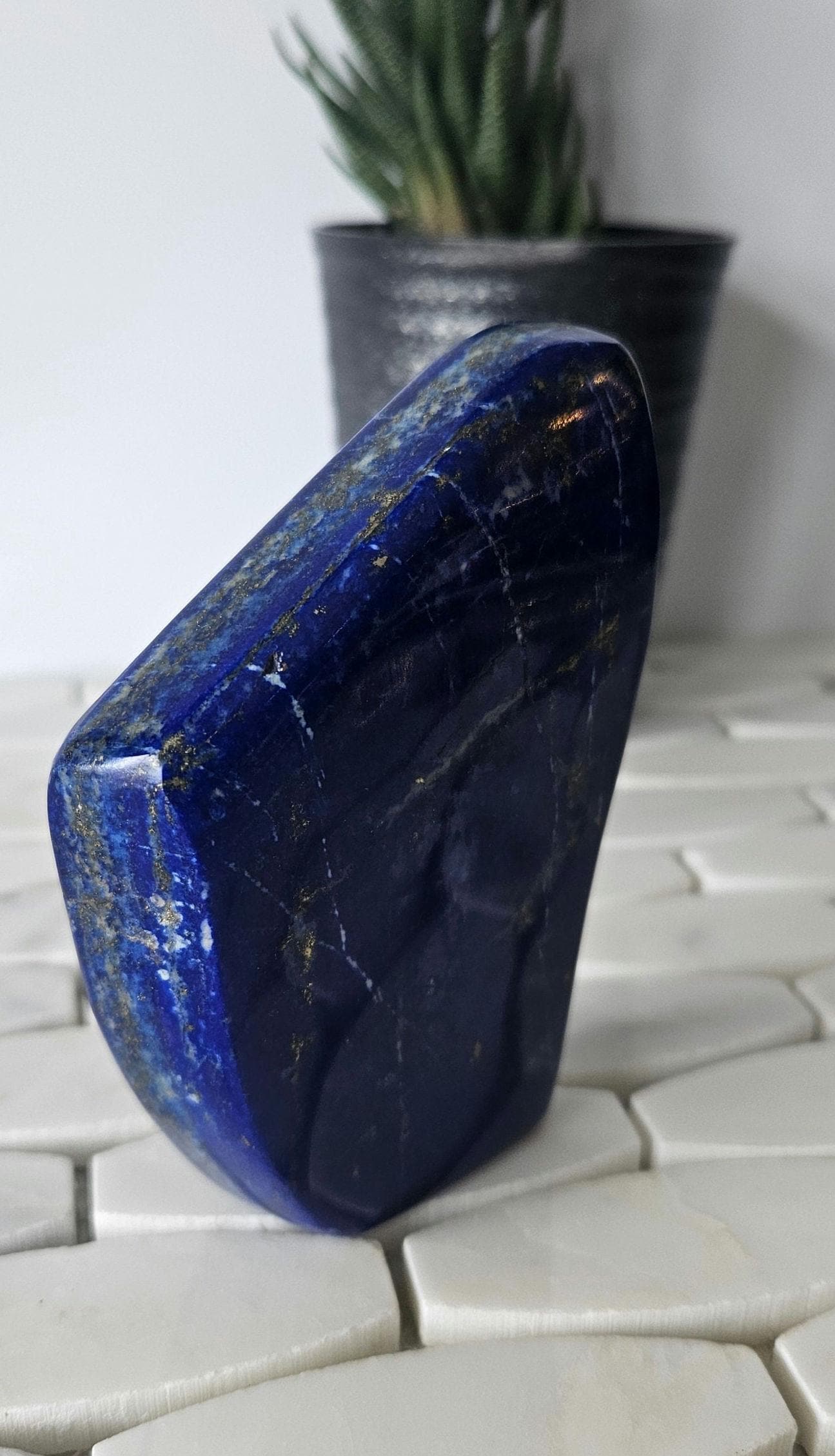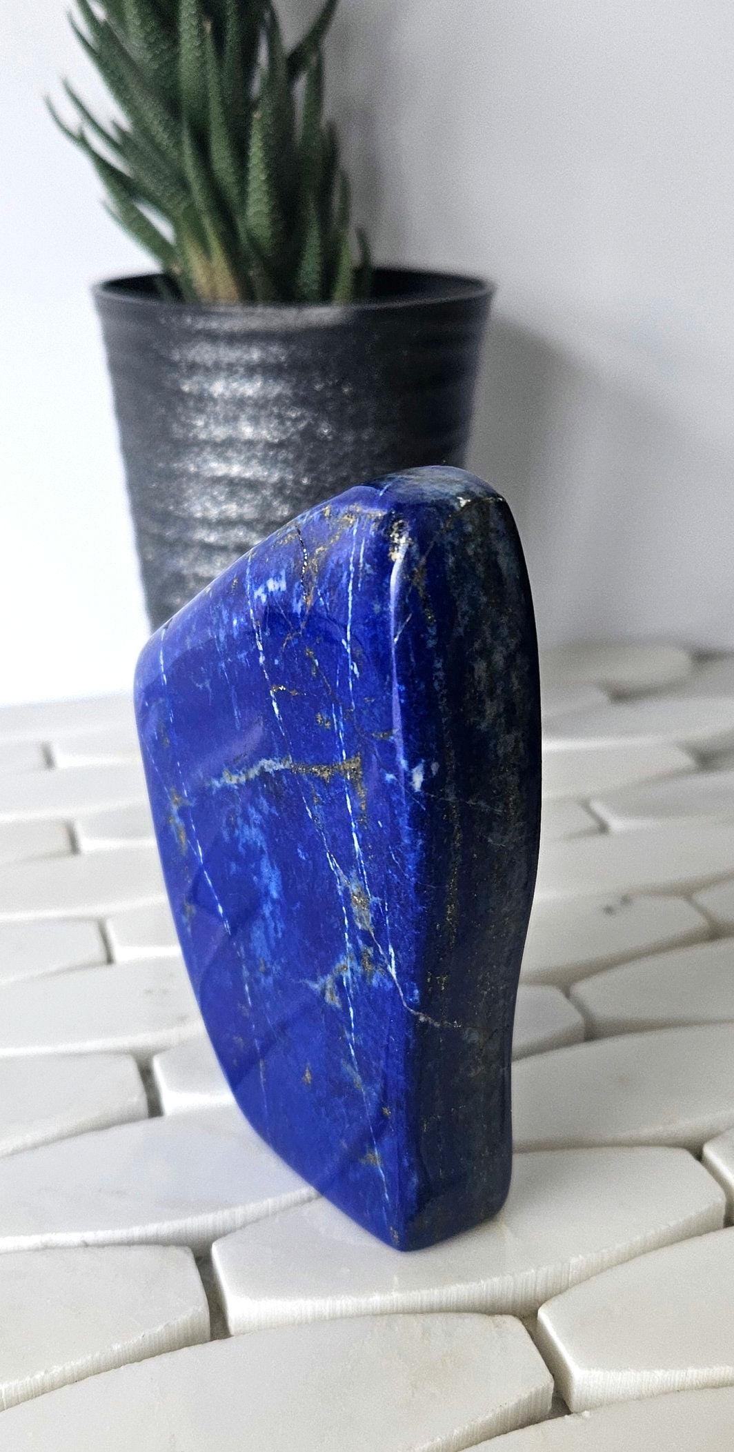 This is a unique A++ Grade Lapis Lazuli from Afghanistan. All the pictures and videos were taken in natural sunlight to showcase its true color, and all the tiny details that make each of the stones unique.