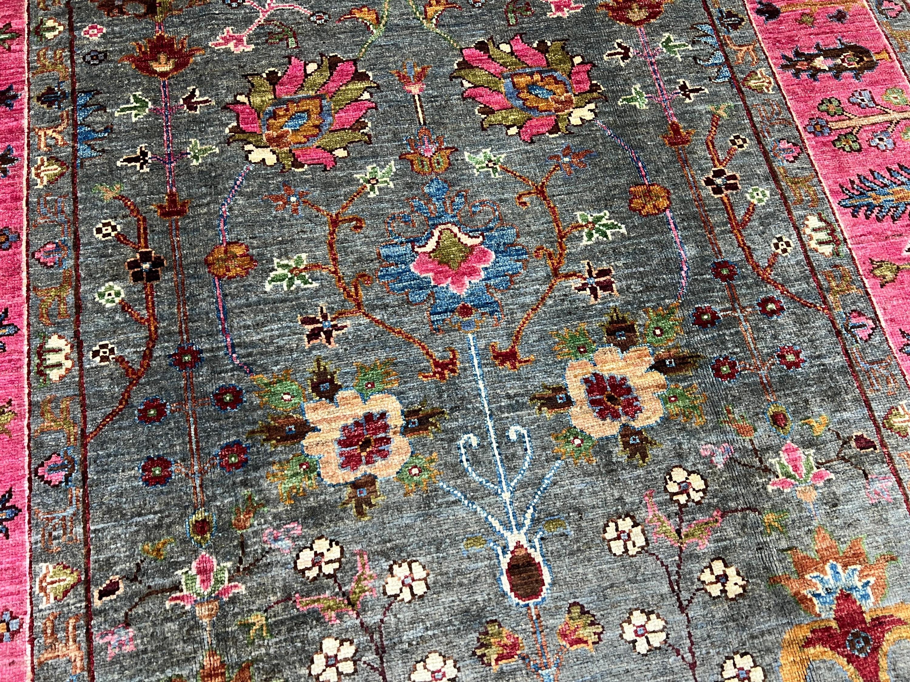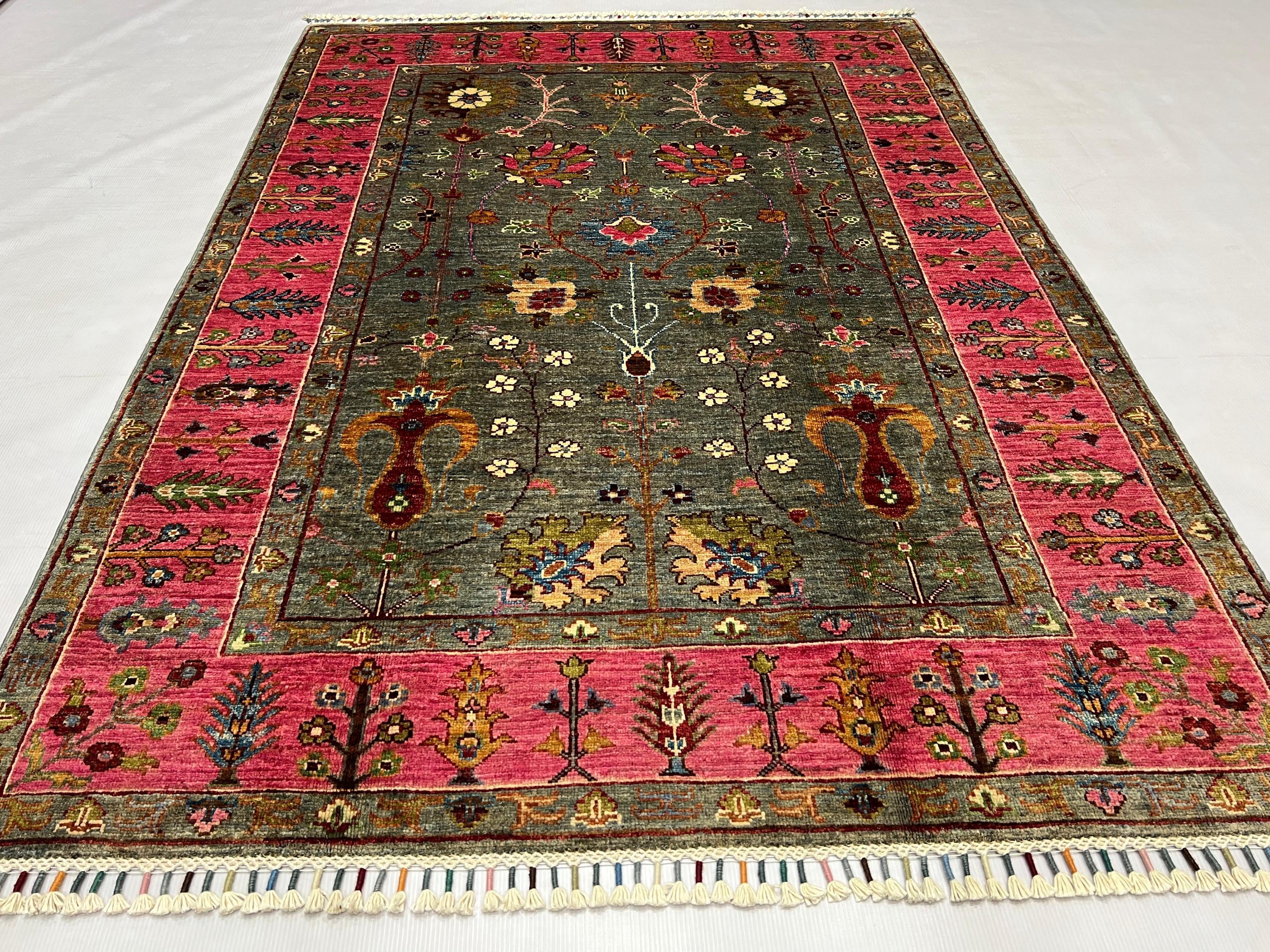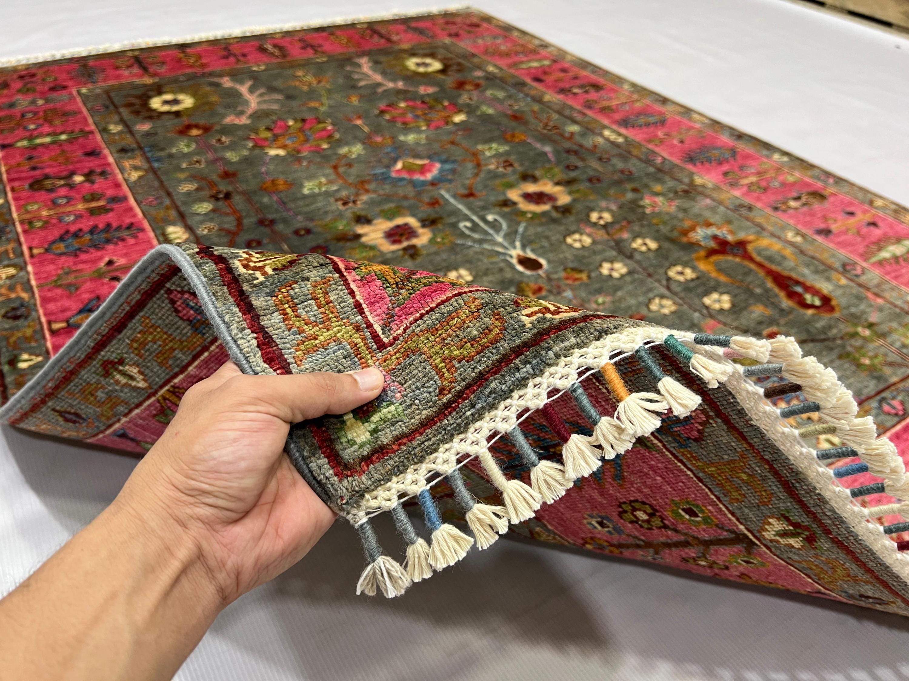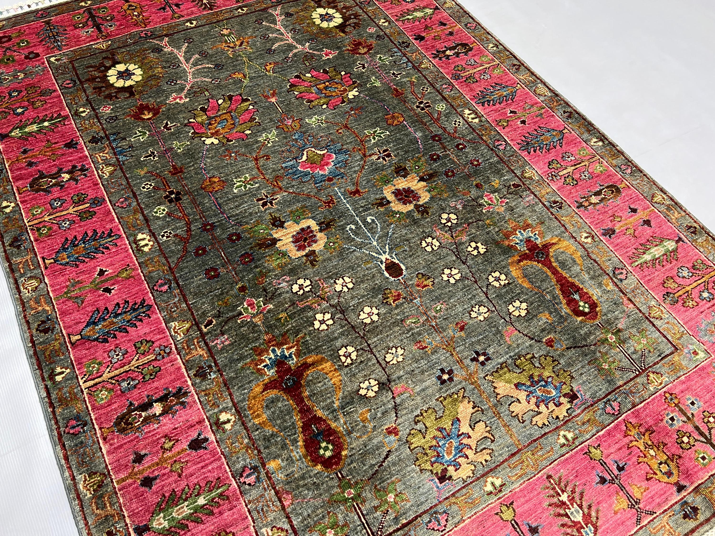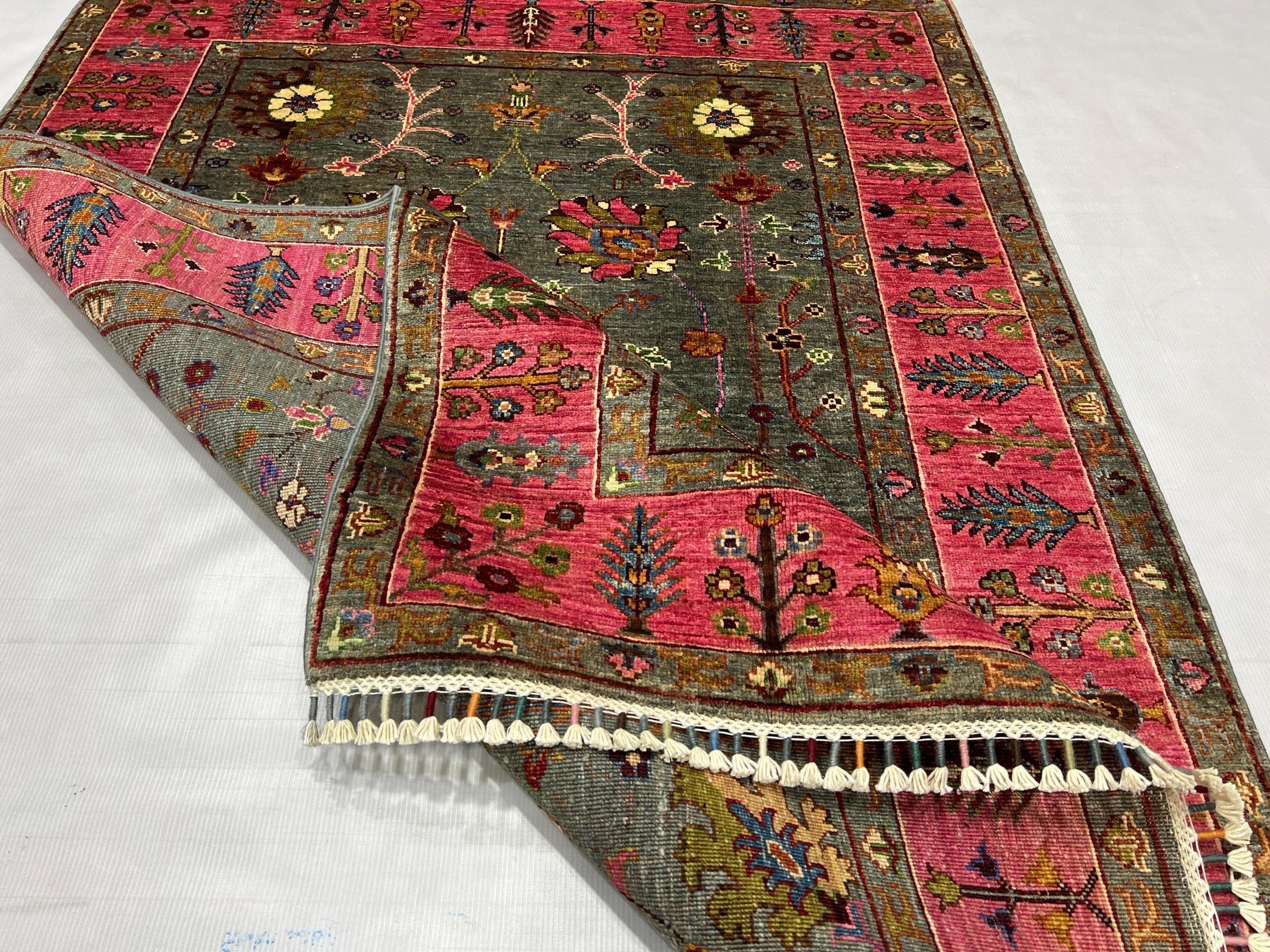 design rug made with famous Afghan Ghazni wool (silk-like soft and durable) on a cotton foundation by Afghan Turkmen artisans in Maymana the capital city of Faryab Province in northwestern Afghanistan, near the Turkmenistan border. As it is handmade, the value of this rug will increase over time and it can be used for generations.