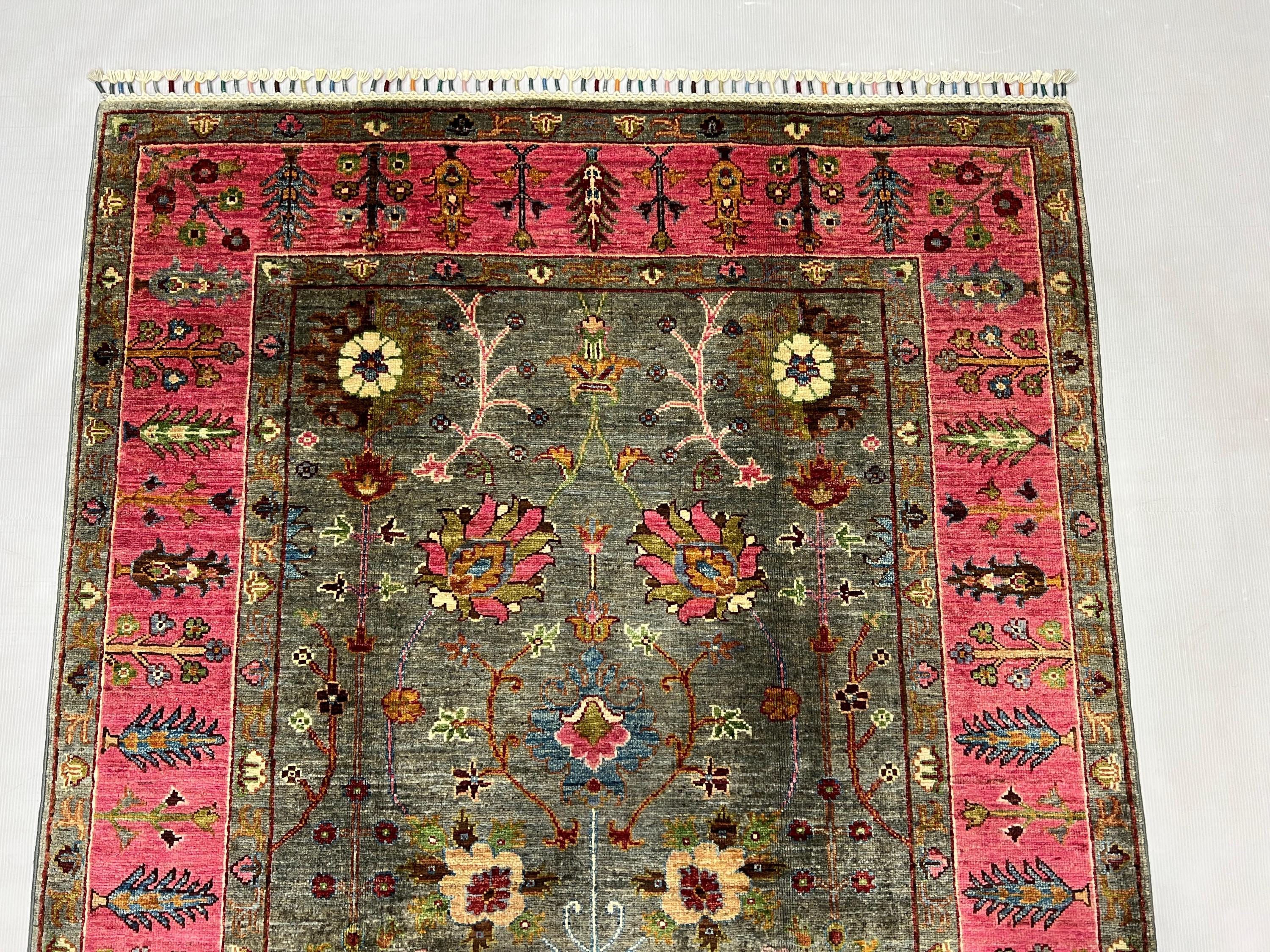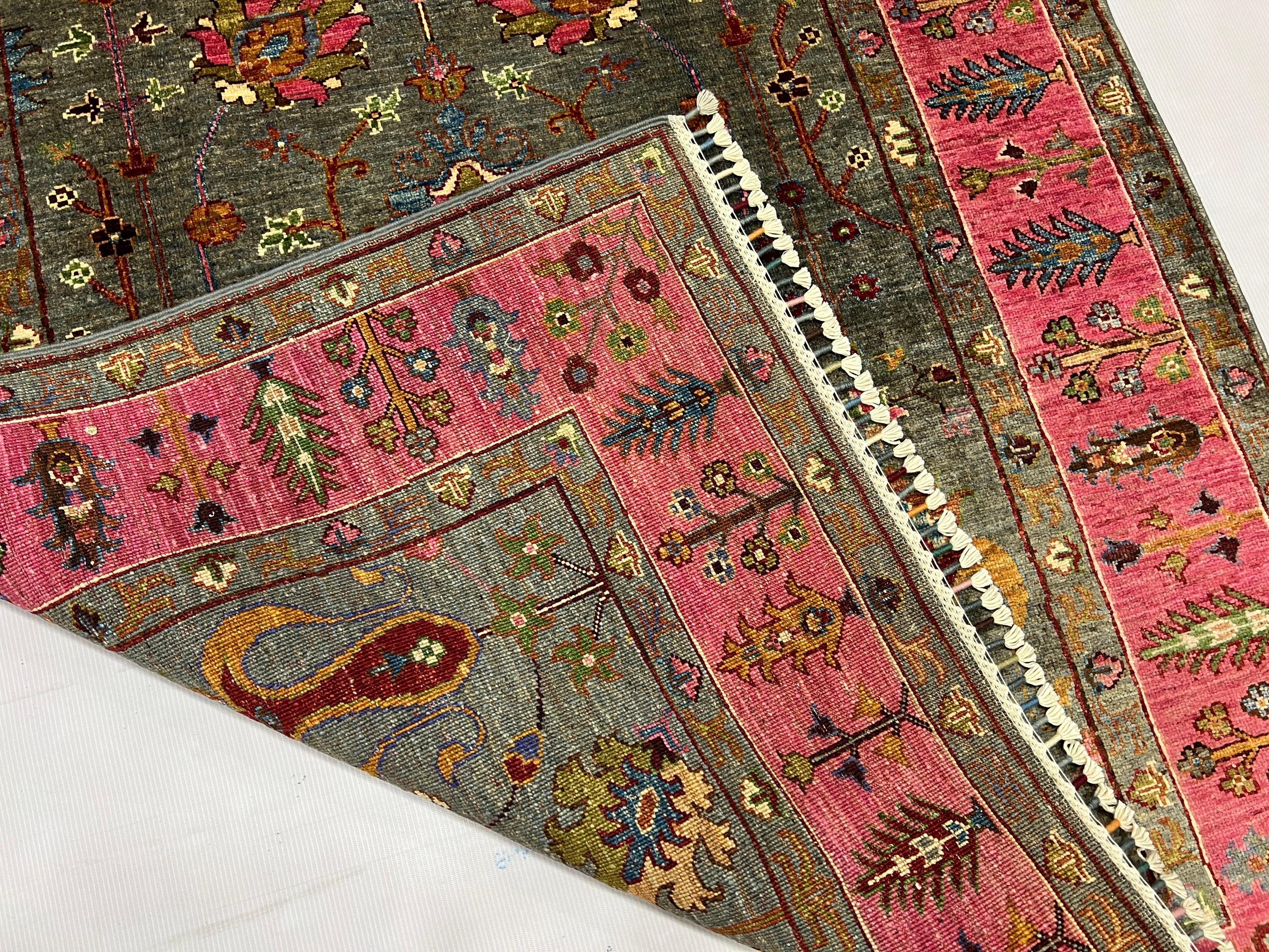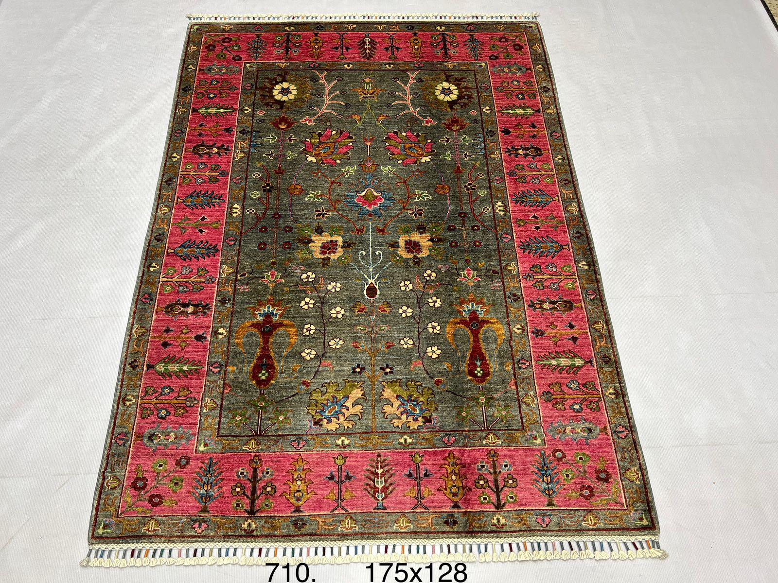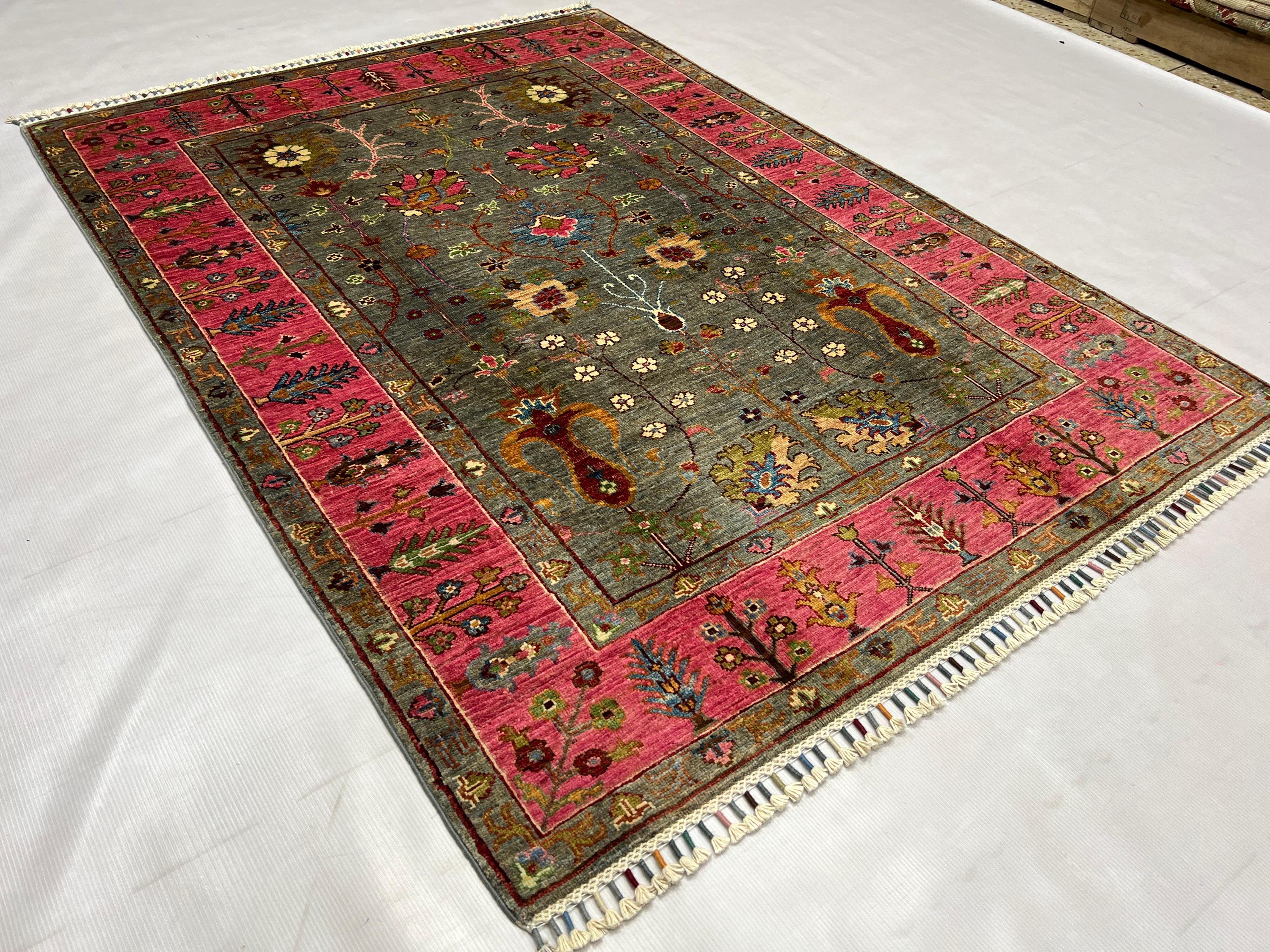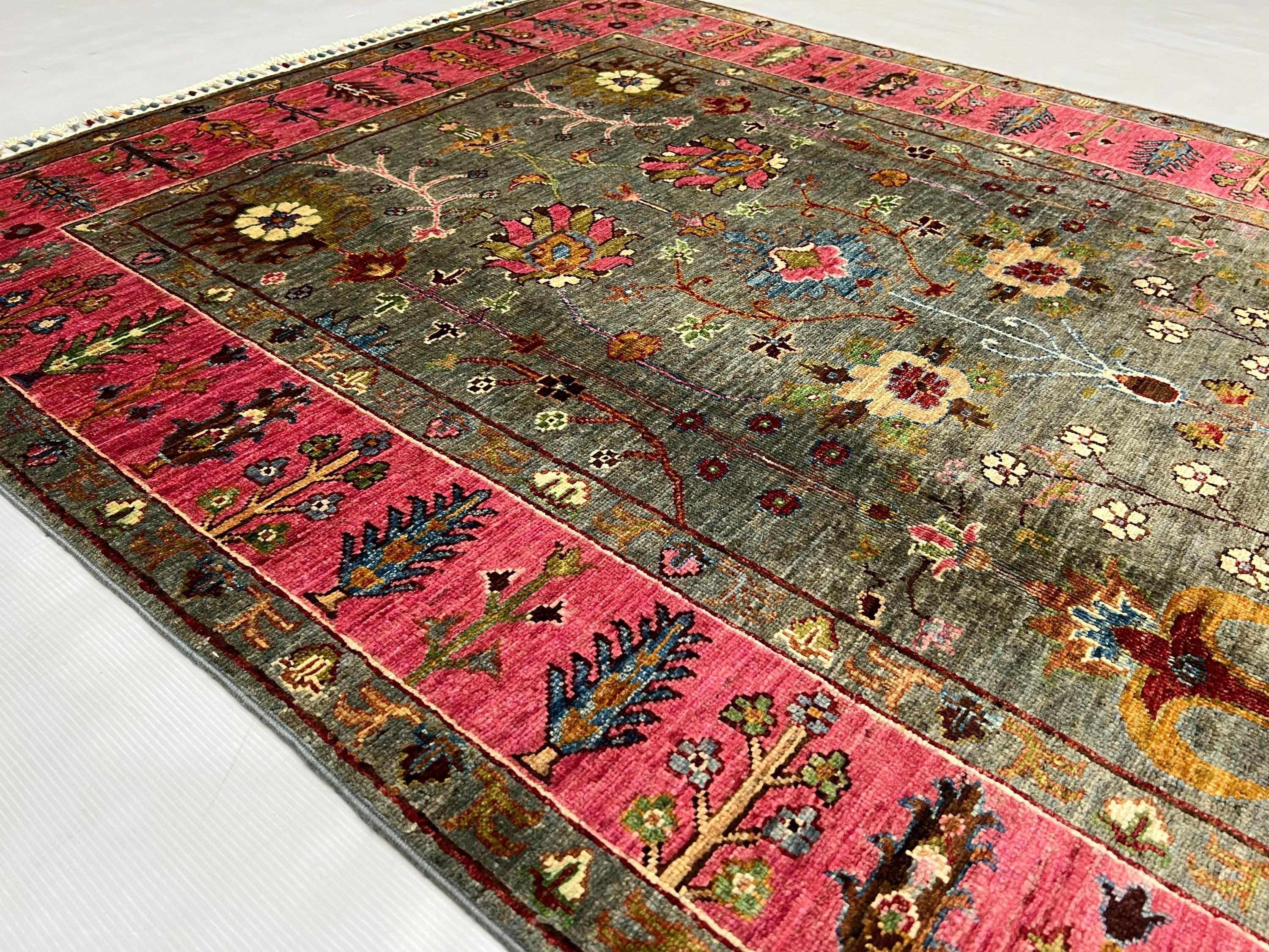 design rug made with famous Afghan Ghazni wool (silk-like soft and durable) on a cotton foundation by Afghan Turkmen artisans in Maymana the capital city of Faryab Province in northwestern Afghanistan, near the Turkmenistan border. As it is handmade, the value of this rug will increase over time and it can be used for generations.