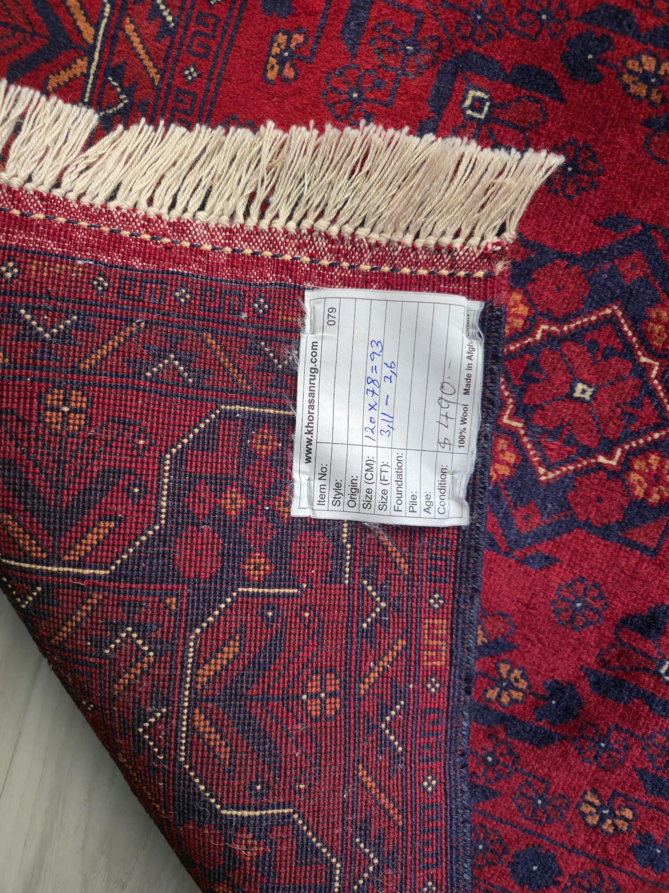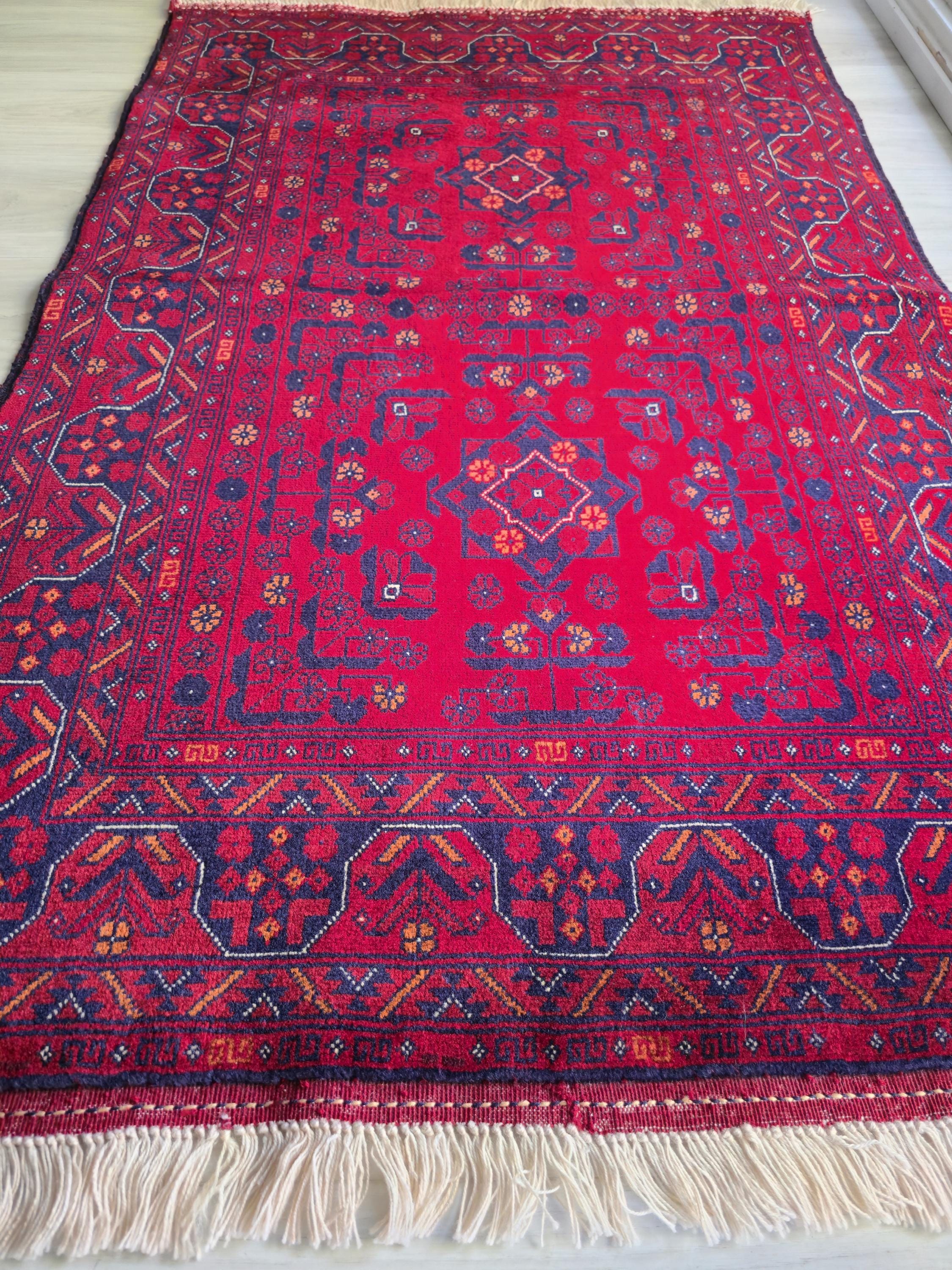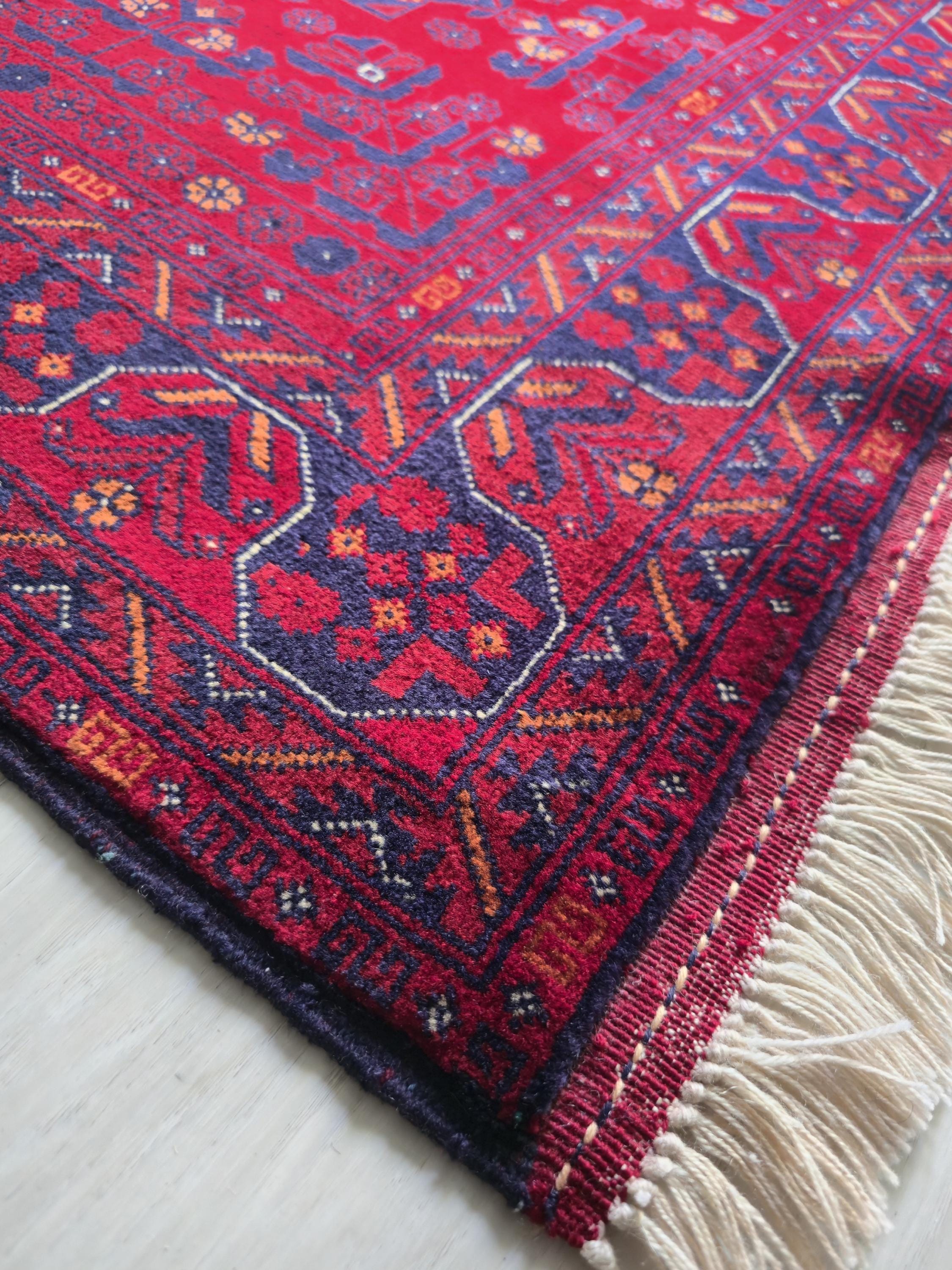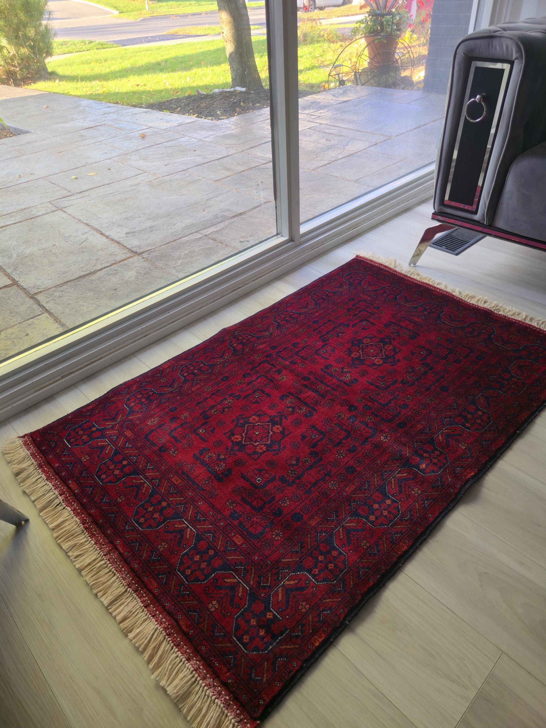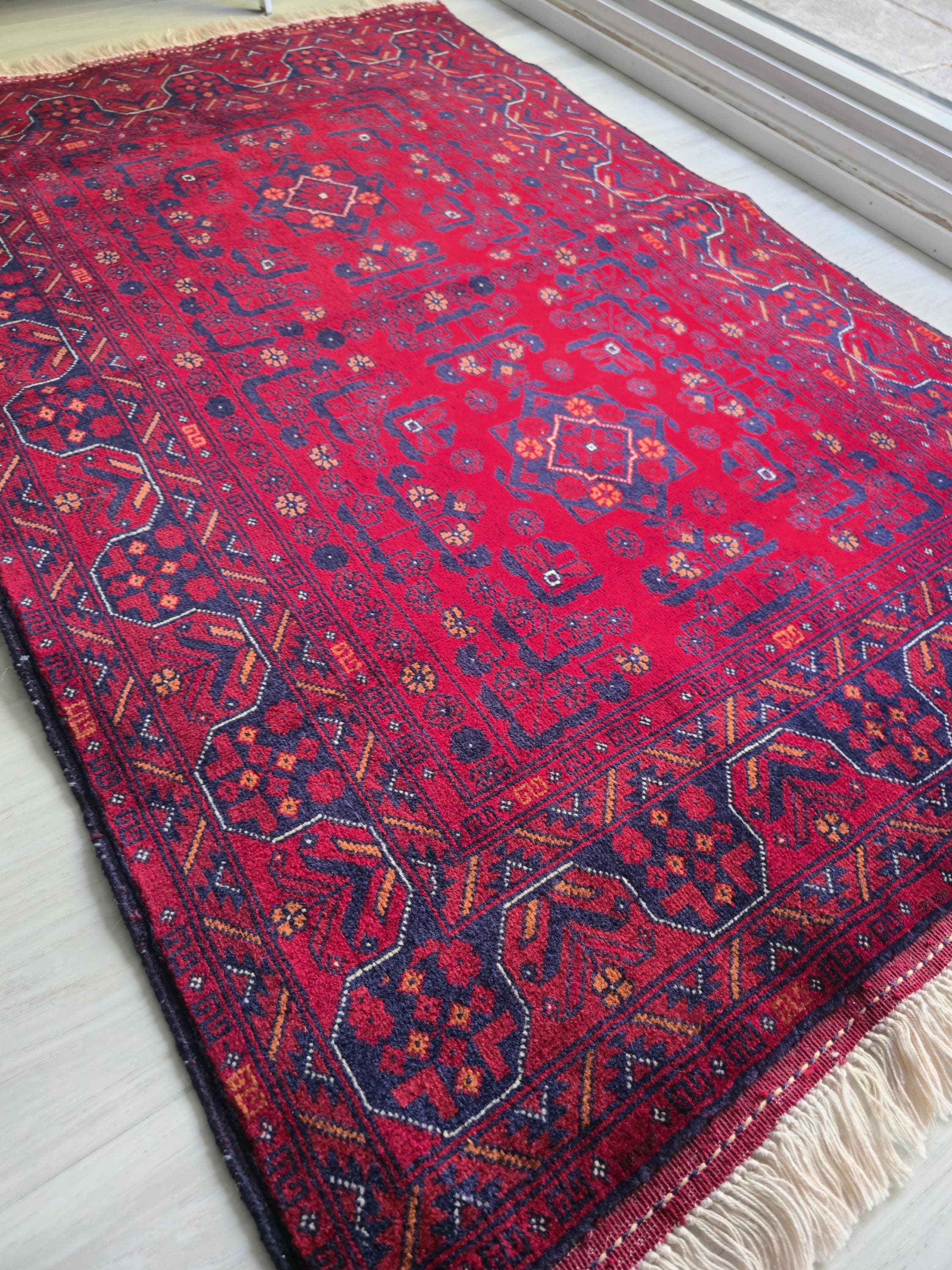 This exquisite handmade Afghan rug is crafted with the highest quality Merino wool imported from New Zealand, known for its exceptional softness, durability, and natural sheen. Measuring 2'6 x 4 ft, this piece embodies the artistry and tradition of Afghan weavers, featuring a deep red tribal pattern enhanced with natural vegetable dyes that age beautifully over time.