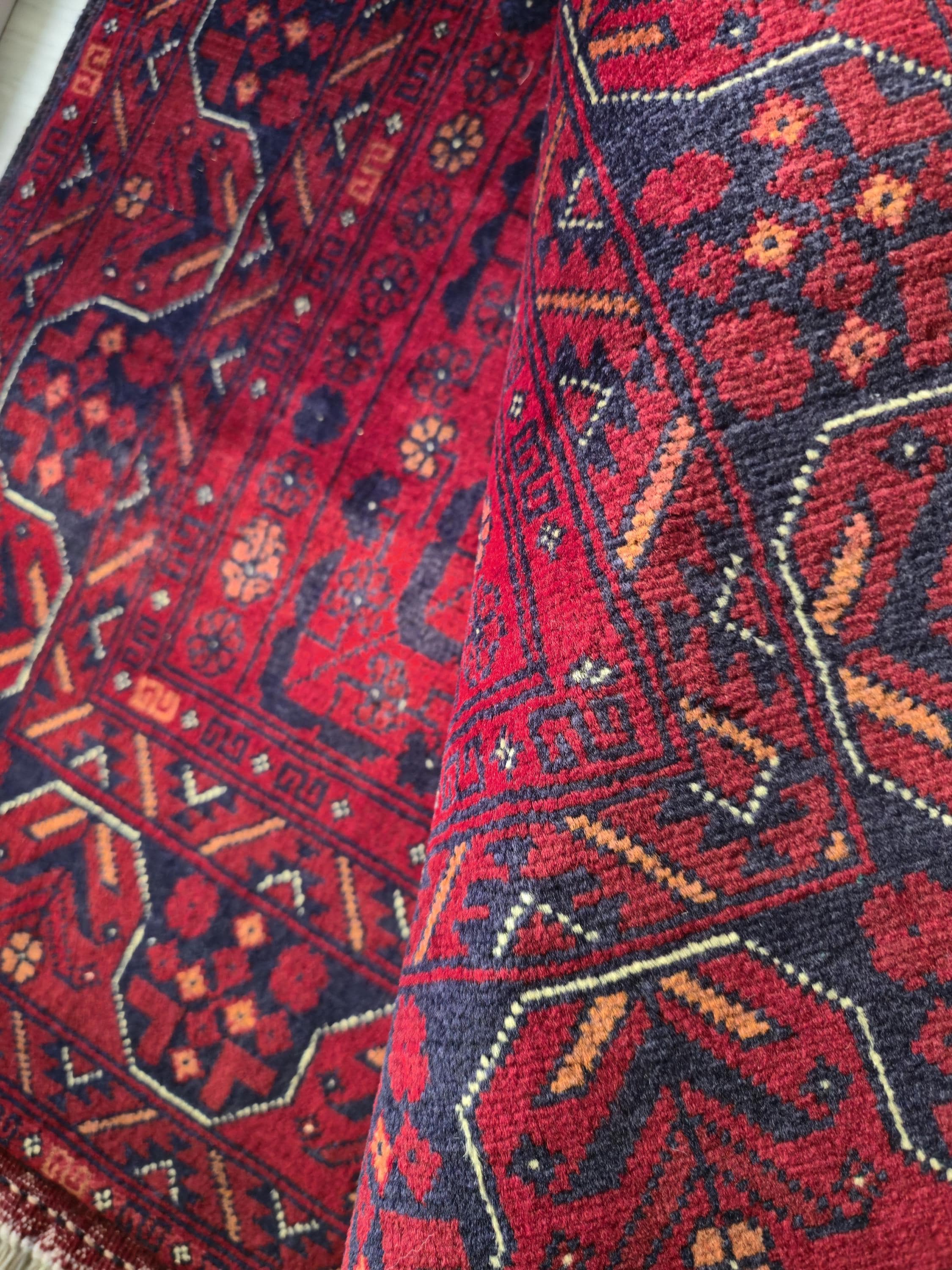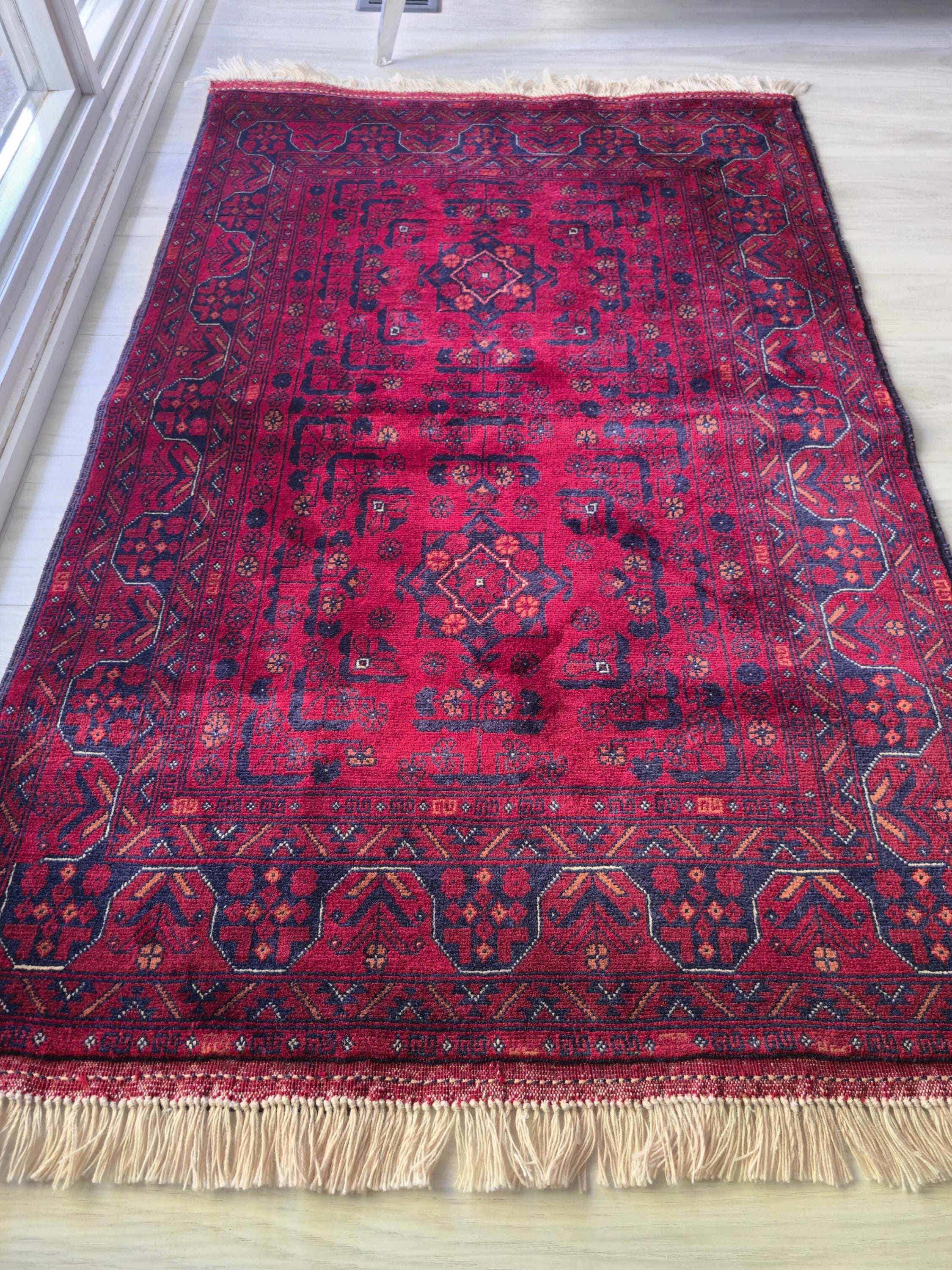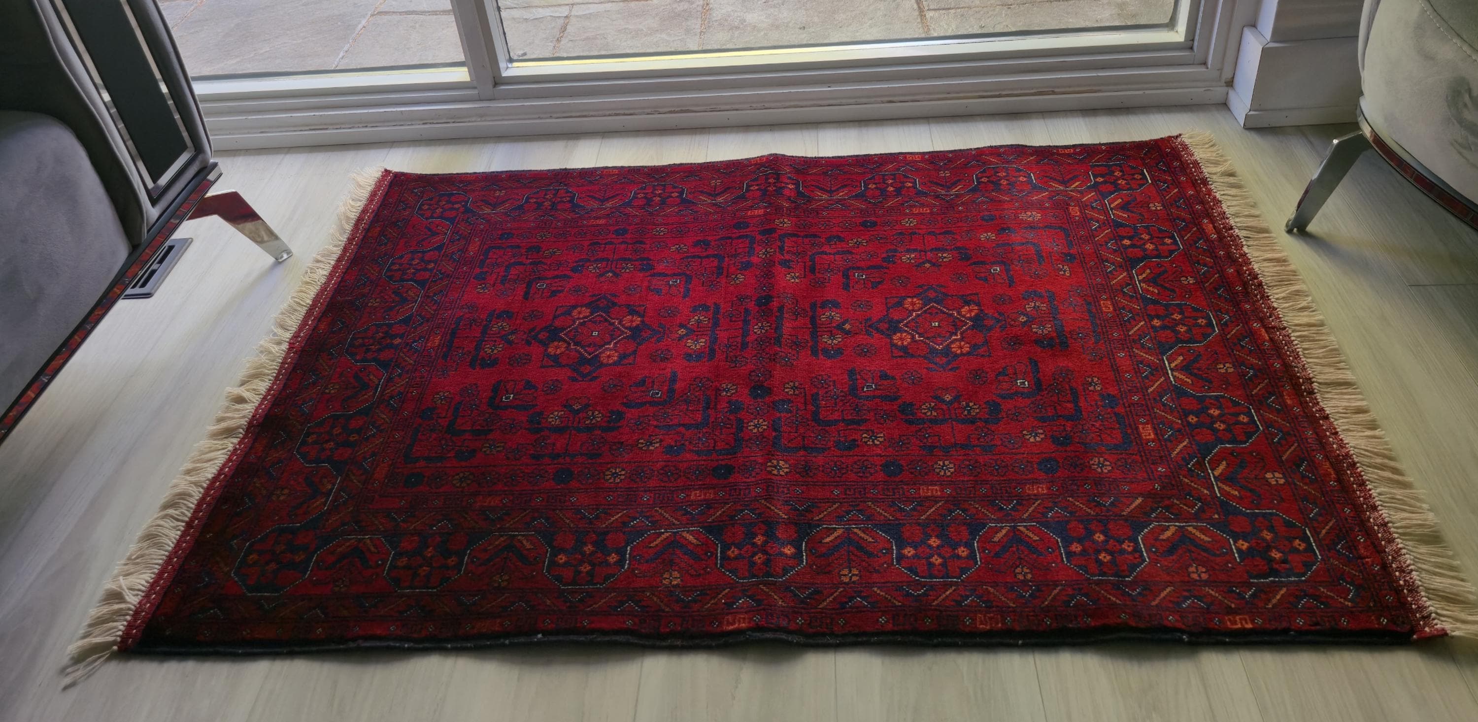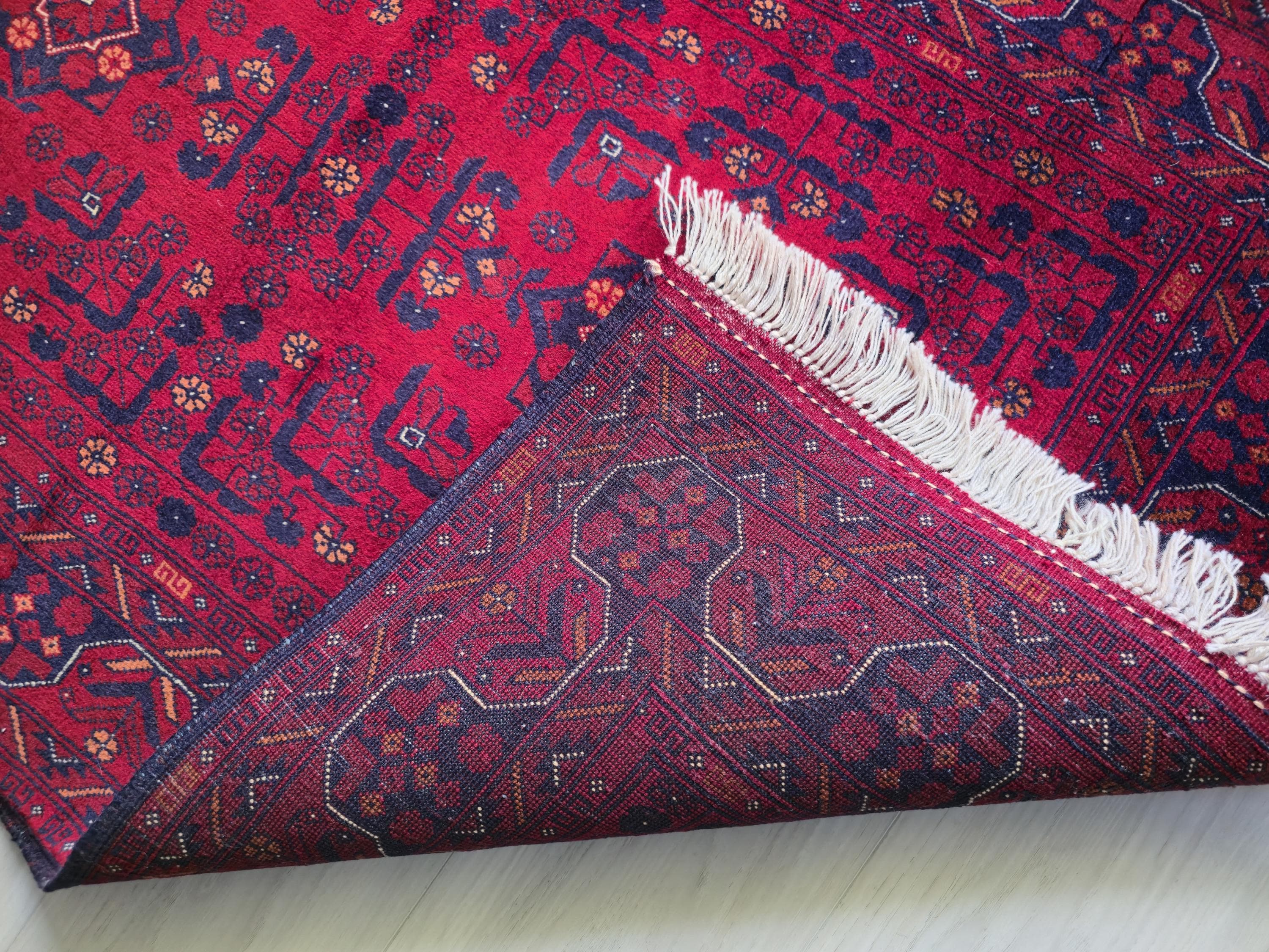 This exquisite handmade Afghan rug is crafted with the highest quality Merino wool imported from New Zealand, known for its exceptional softness, durability, and natural sheen. Measuring 2'6 x 4 ft, this piece embodies the artistry and tradition of Afghan weavers, featuring a deep red tribal pattern enhanced with natural vegetable dyes that age beautifully over time.