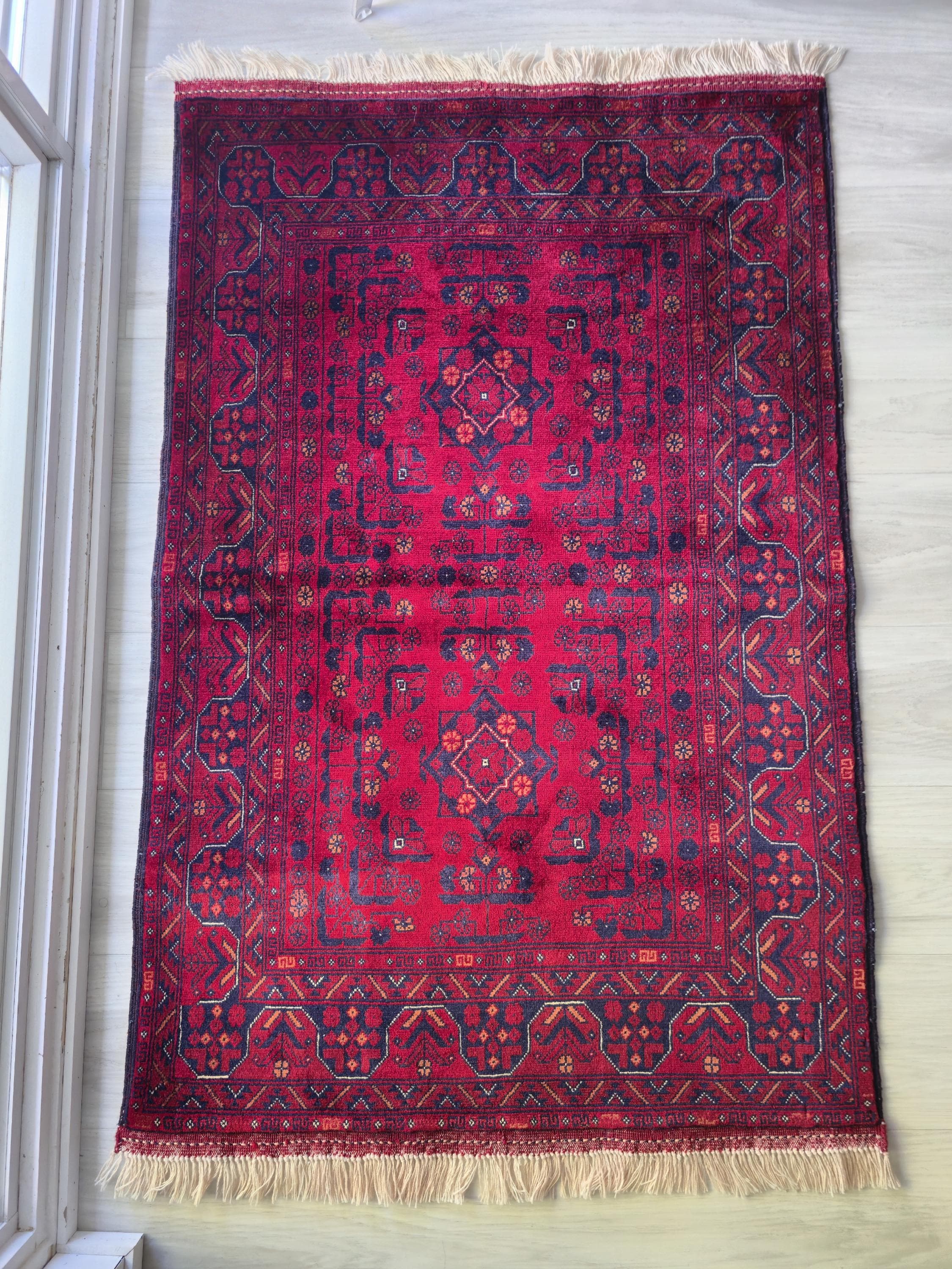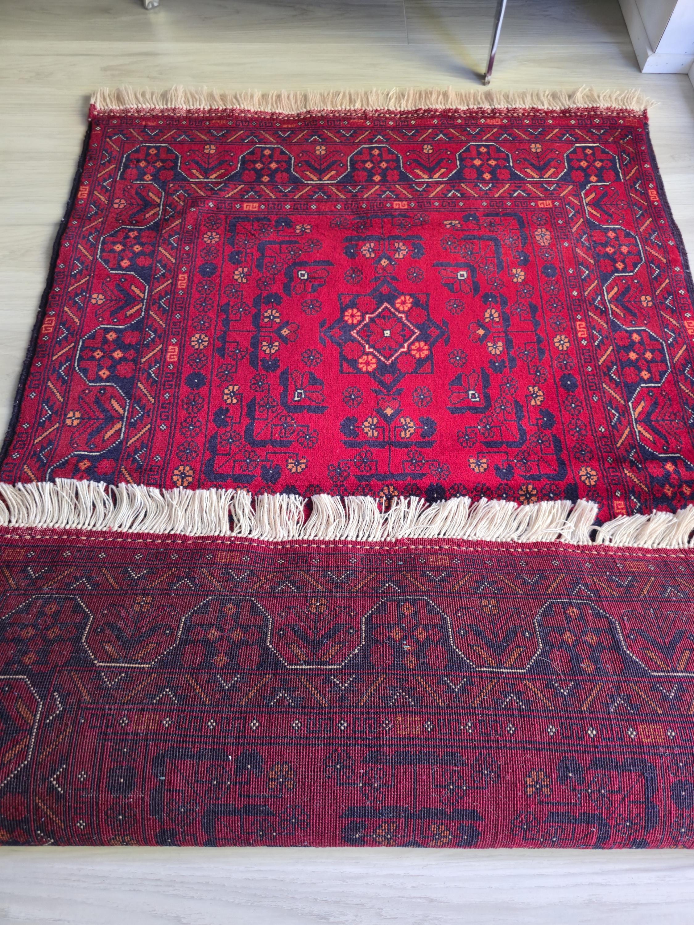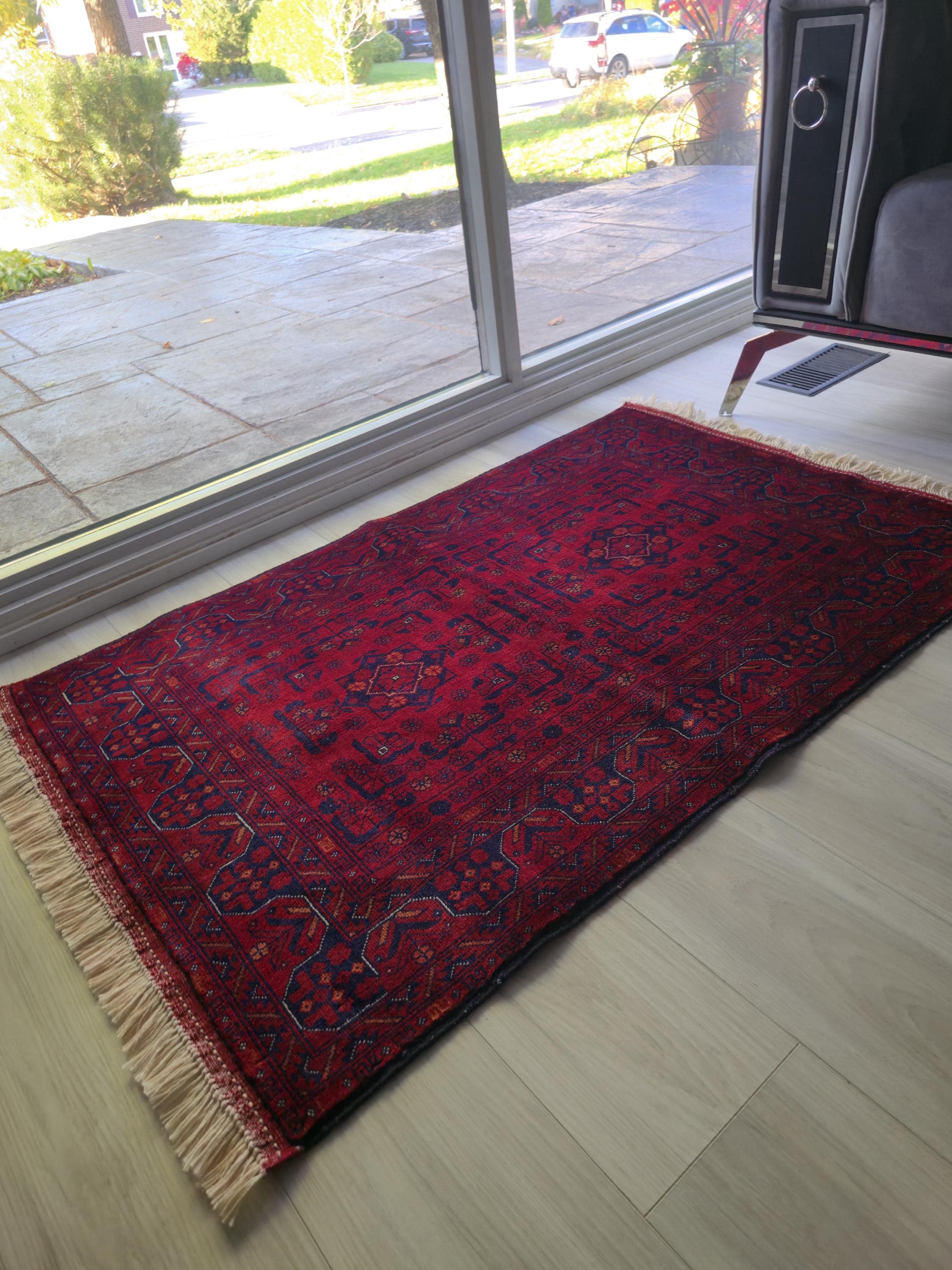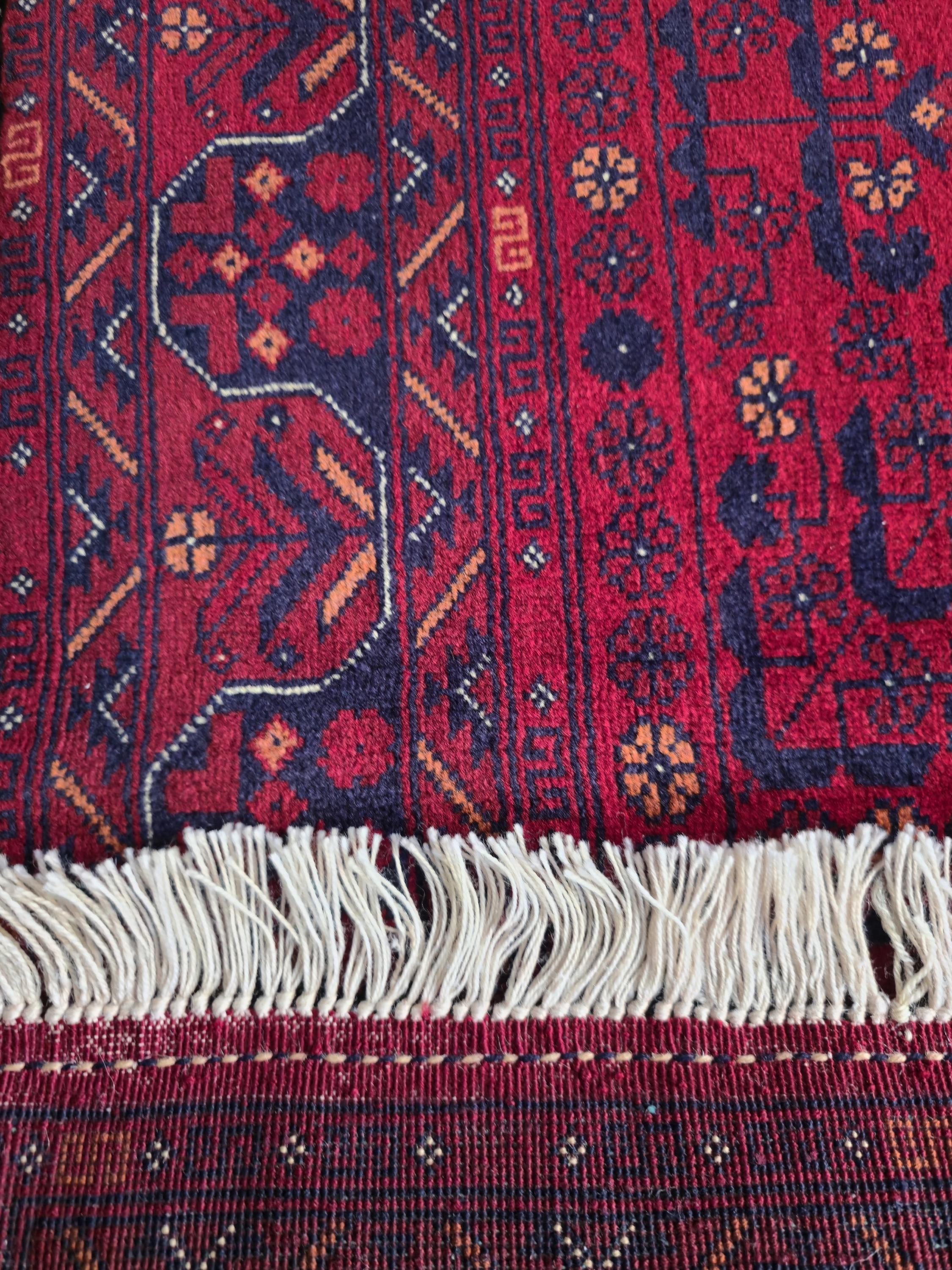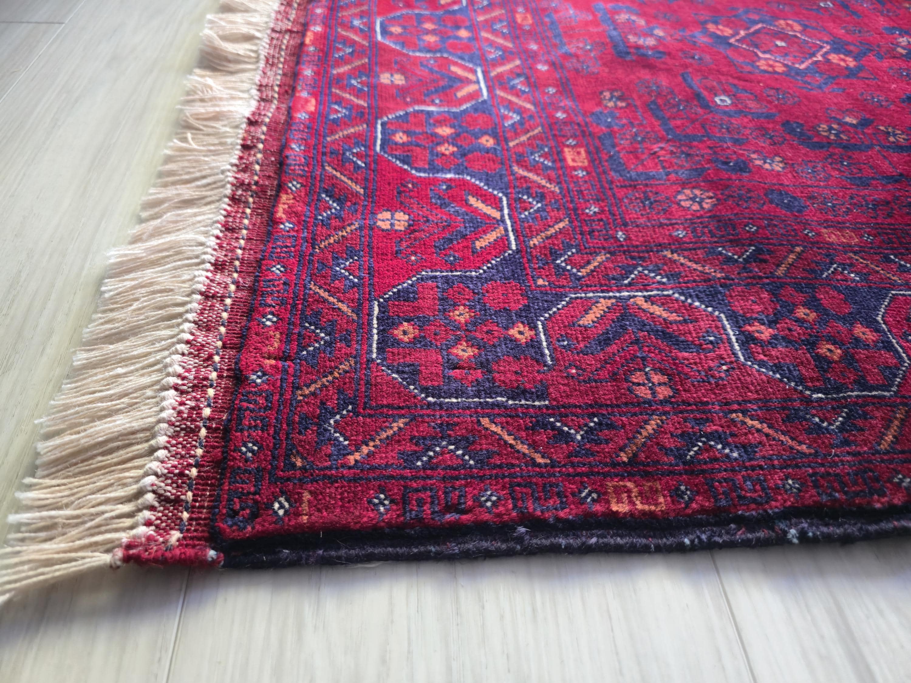 This exquisite handmade Afghan rug is crafted with the highest quality Merino wool imported from New Zealand, known for its exceptional softness, durability, and natural sheen. Measuring 2'6 x 4 ft, this piece embodies the artistry and tradition of Afghan weavers, featuring a deep red tribal pattern enhanced with natural vegetable dyes that age beautifully over time.