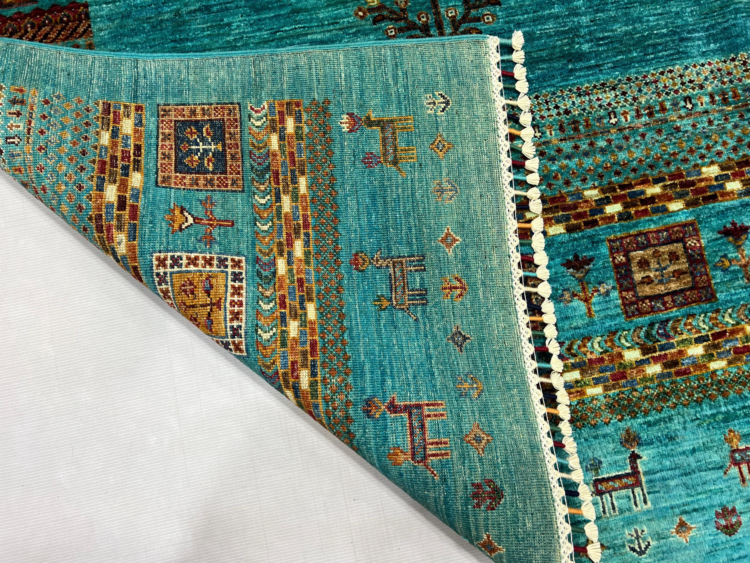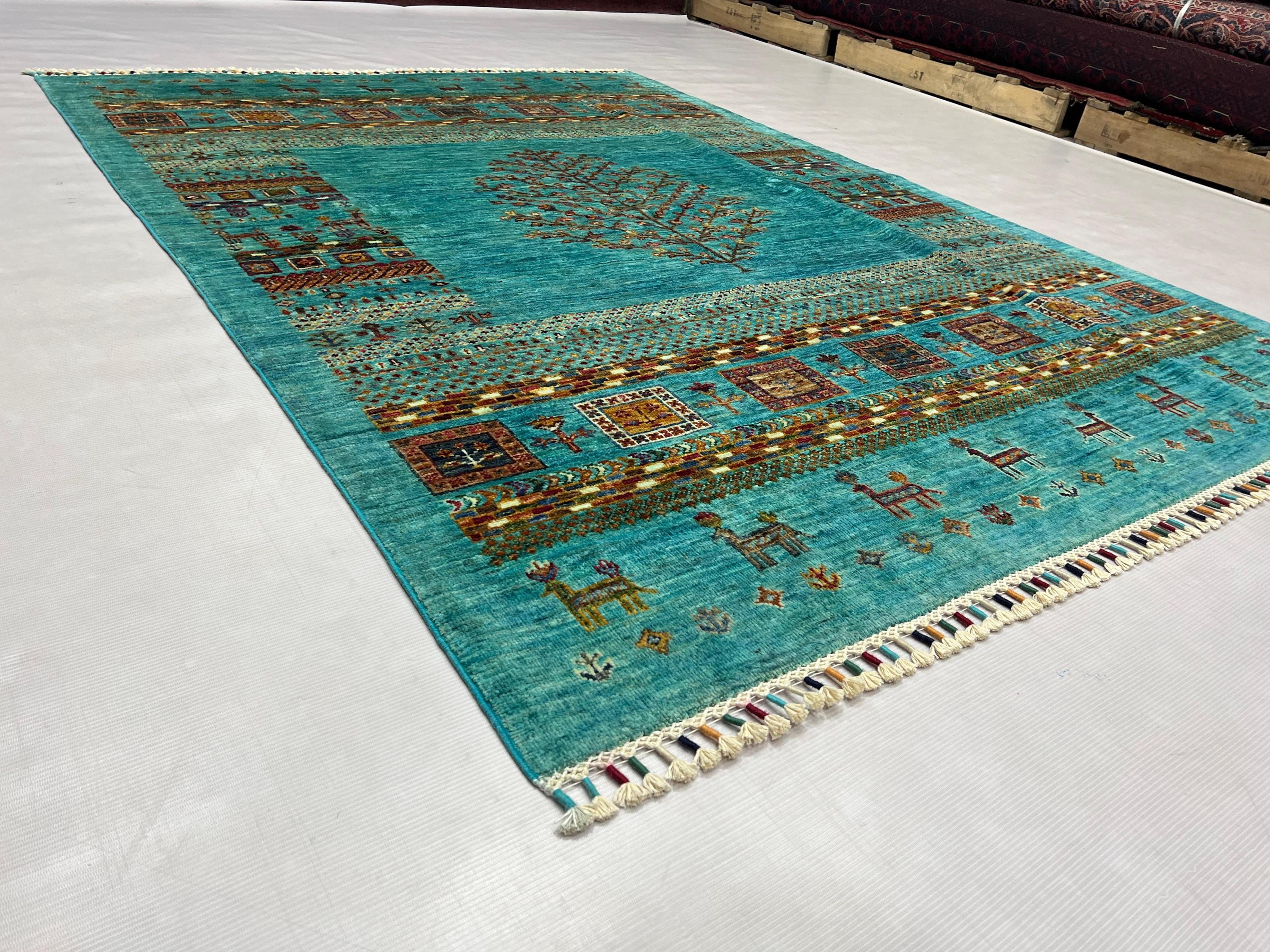 This piece is called a "Mamluk" rug, originated from Afghanistan. Mamluk rug are meant to showcase very classic 1800s designed Turkish and Persian rug. Mamluk rugs in general always try to focus the rug around medallions in the middle, or scattered throughout the rug. Handmade Mamluk-inspired designs are highly sought after today and many feature the signature intersecting compartments surrounding bold medallions.
