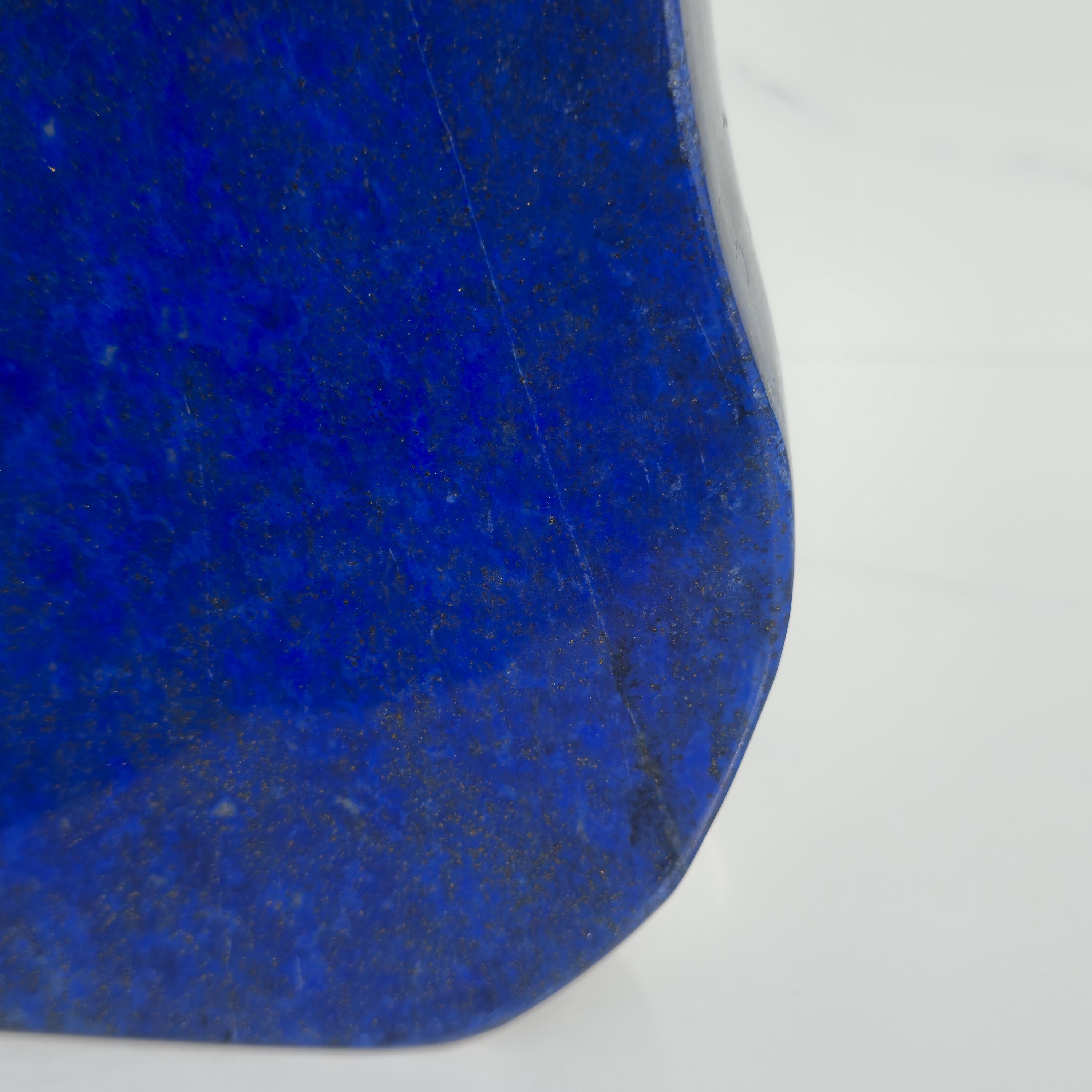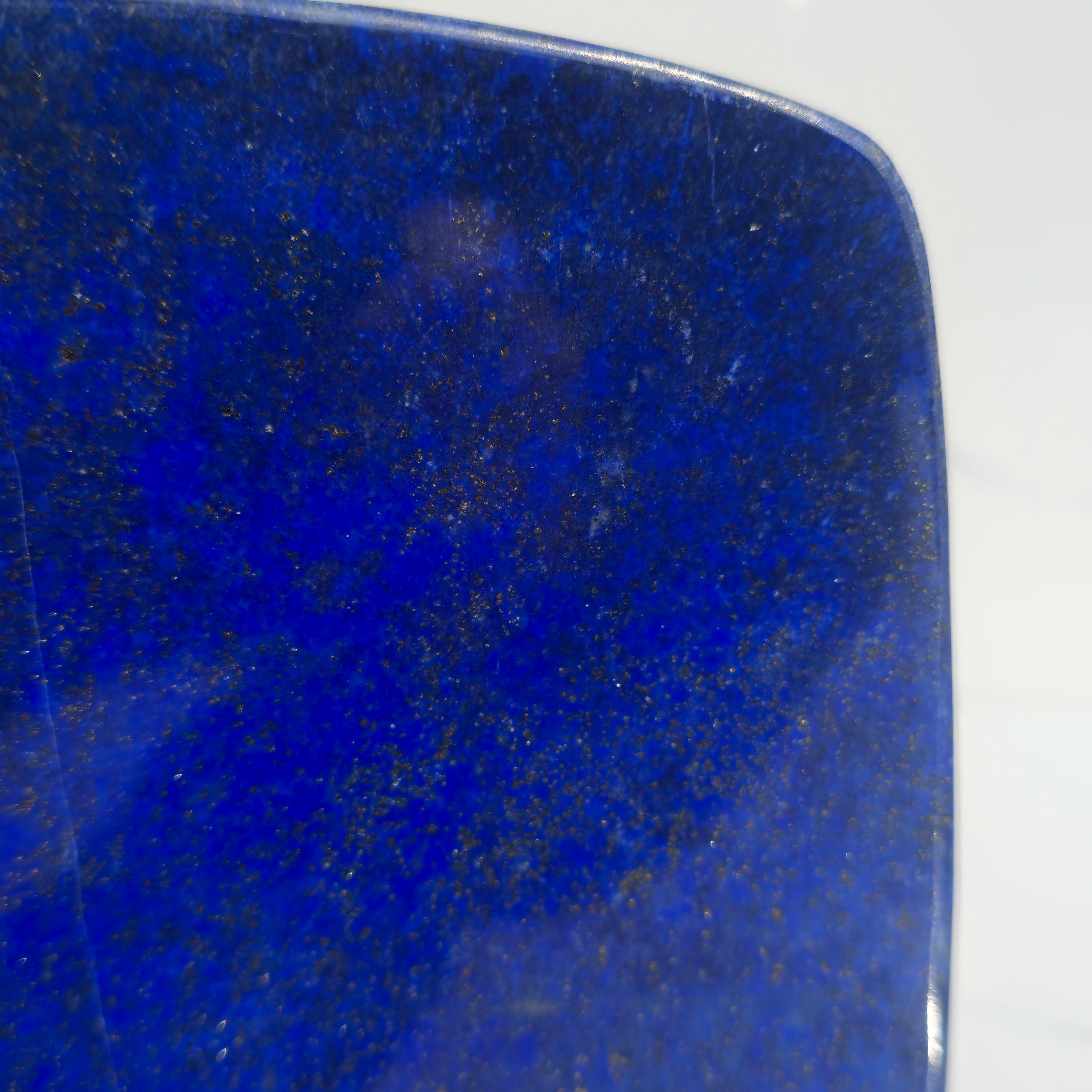 The stone features a rich deep blue color with natural golden pyrite inclusions and subtle calcite variations, confirming its natural origin. The surface has been polished to enhance the color and mineral pattern while preserving the stone's organic character.